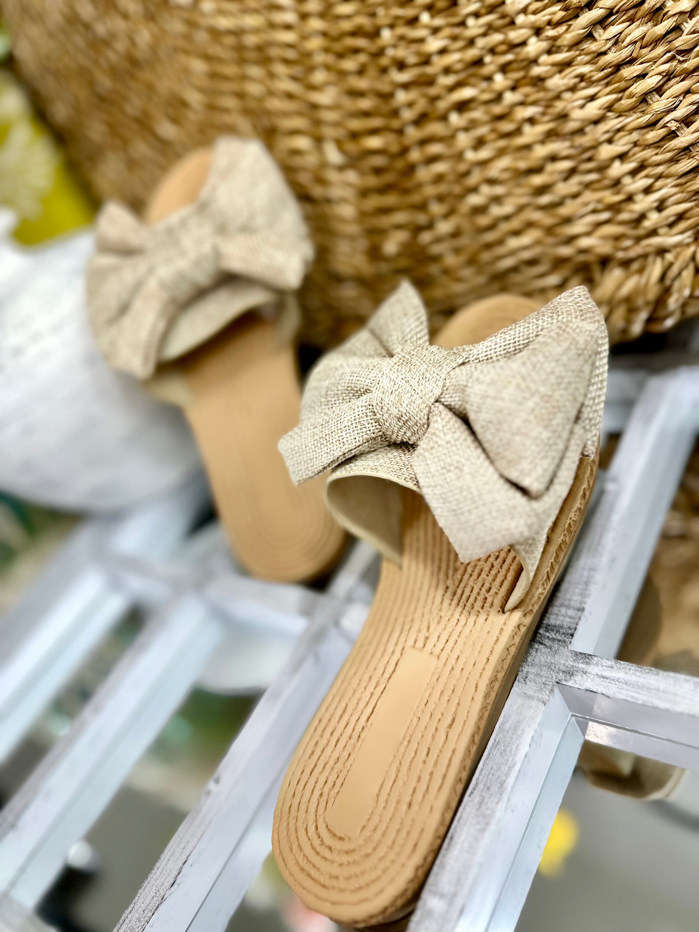 These slip-on sandals combine comfort and style, perfect for all-day wear. The wide upper strap features a big, adorable bow that adds a touch of whimsy. Made from breathable linen fabric, these sandals pamper your feet.