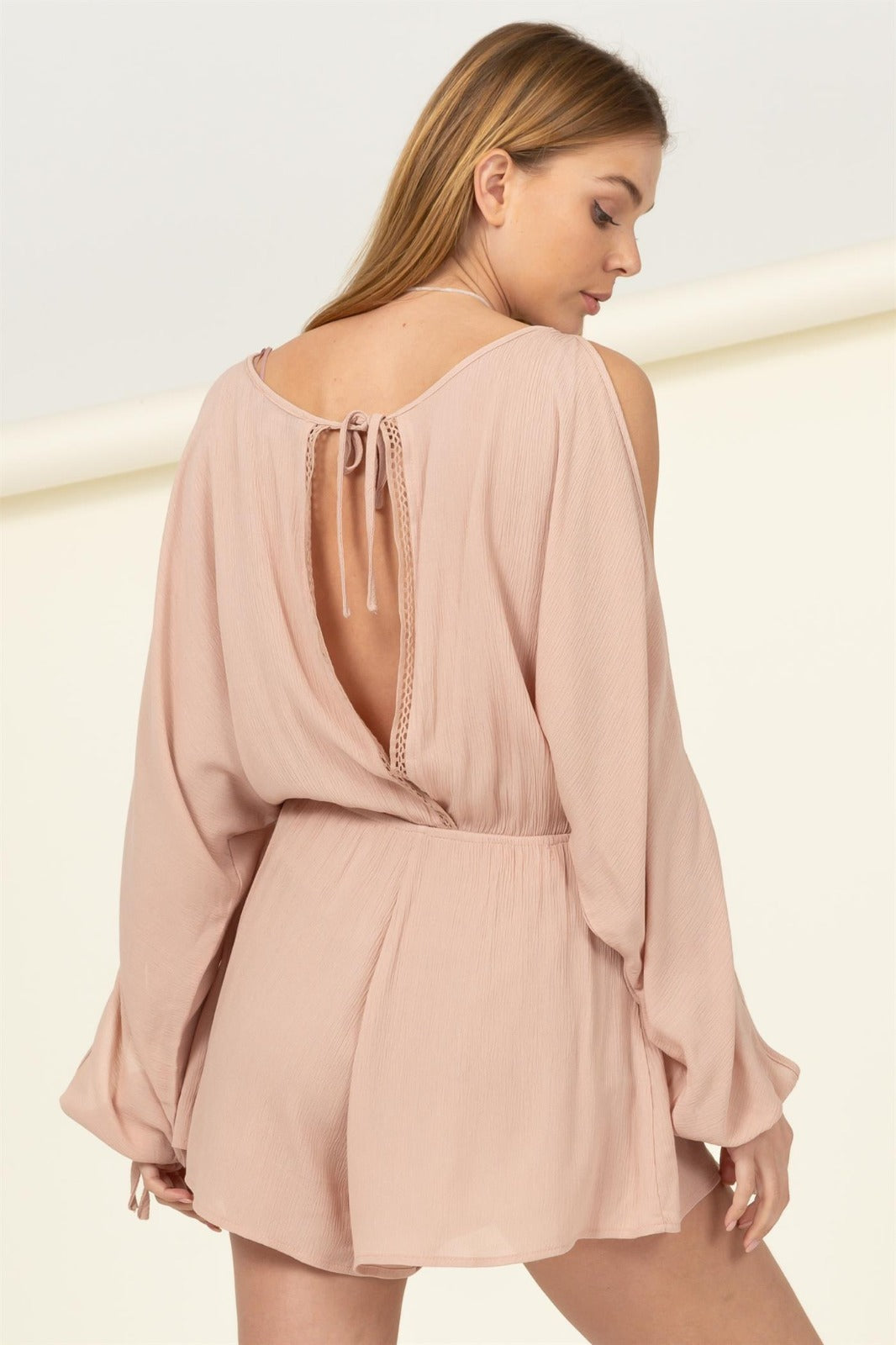 Embrace chic comfort in this cold-shoulder romper. Flowy sleeves meet a flattering surplice neckline for a look that's effortless and elegant.