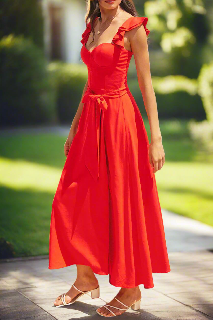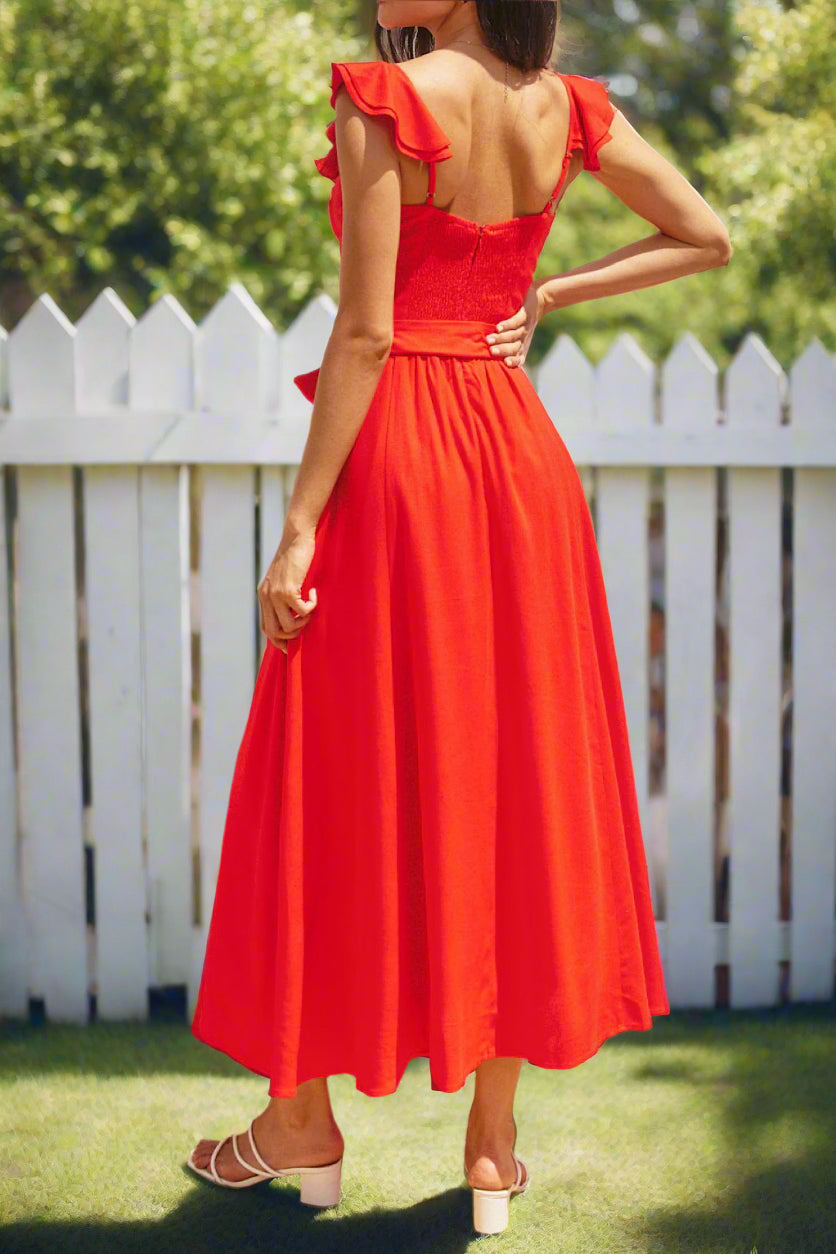 Flutter sleeves add a touch of playful femininity, while the adjustable shoulder straps ensure a perfect fit. A daring side front slit adds a touch of allure, and the detachable waist tie allows you to customize the silhouette.