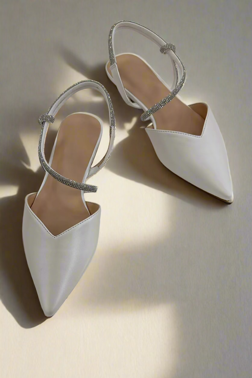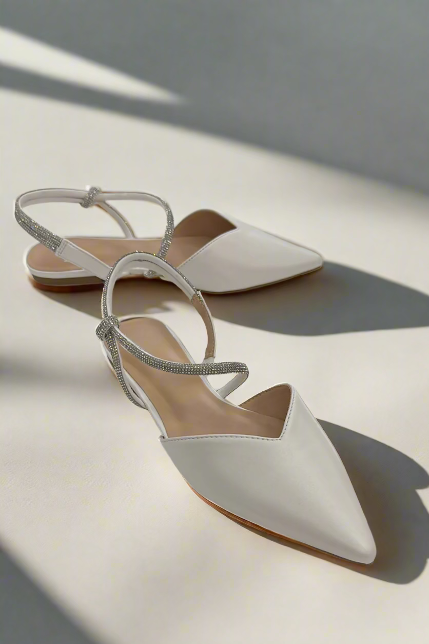 The sleek, minimalist design in a pearl satin white finish is elevated by delicate, crystal-embellished ankle straps that add a touch of sparkle. Perfect for both daytime sophistication and evening allure, these flats offer comfort without compromising on style. A versatile addition to any wardrobe.