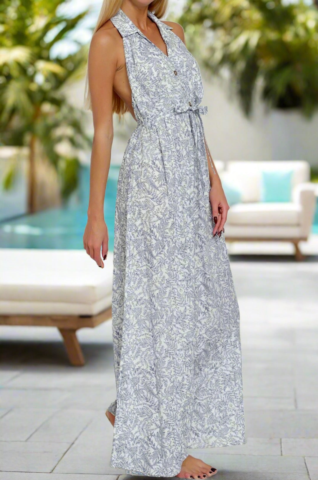 Channel effortless summer vibes with the Belted Halter Jumpsuit, a show-stopping piece designed to turn heads. The flattering halter neckline beautifully highlights your shoulders and elongates your neck, while the button-down detail at the back adds a touch of sophisticated surprise. A stylish belt cinches your waist, creating a defined silhouette that flatters all body types. The daring and undeniably modern backless design adds a touch of allure, perfect for warm summer nights. Crafted from 100% cotton for both style and comfort, this breathable jumpsuit keeps you cool on hot summer days and transitions effortlessly from day to night. Let the Belted Halter Jumpsuit be your statement piece for effortless summer chic.