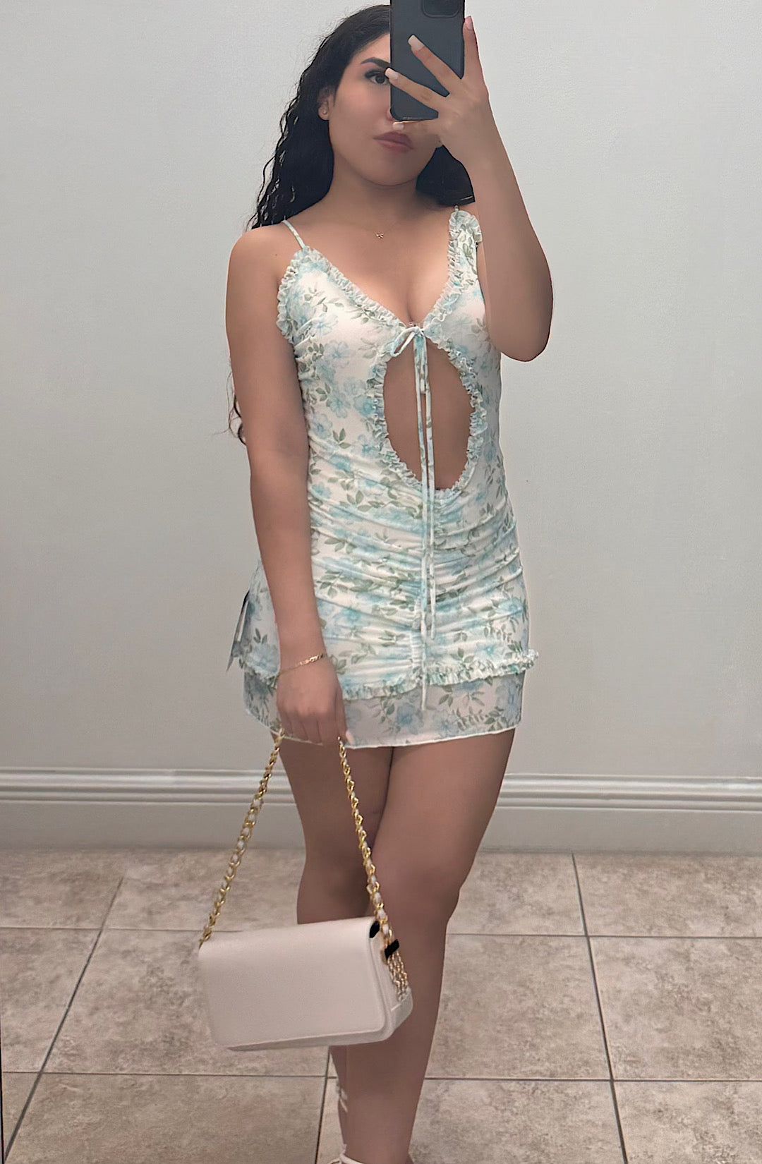 Sweet meets daring in this floral cutout mini dress, made to turn heads from brunch to beachside cocktails. Designed with a delicate blue-and-white floral print, this flirty mini features a keyhole front cutout, adjustable tie detail, and subtle ruffled trim that adds a romantic edge. The stretchy mesh fabric offers a curve-hugging fit while keeping things breezy and light.