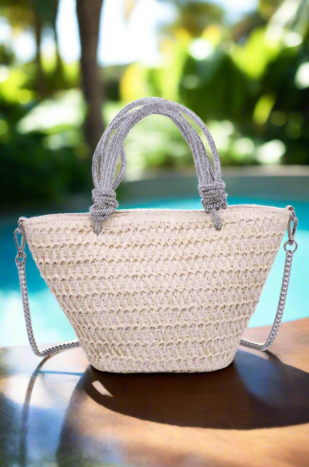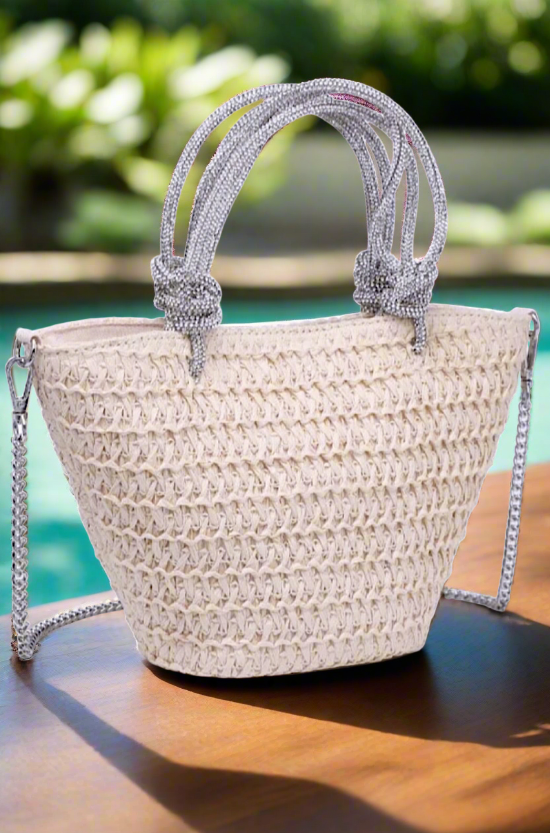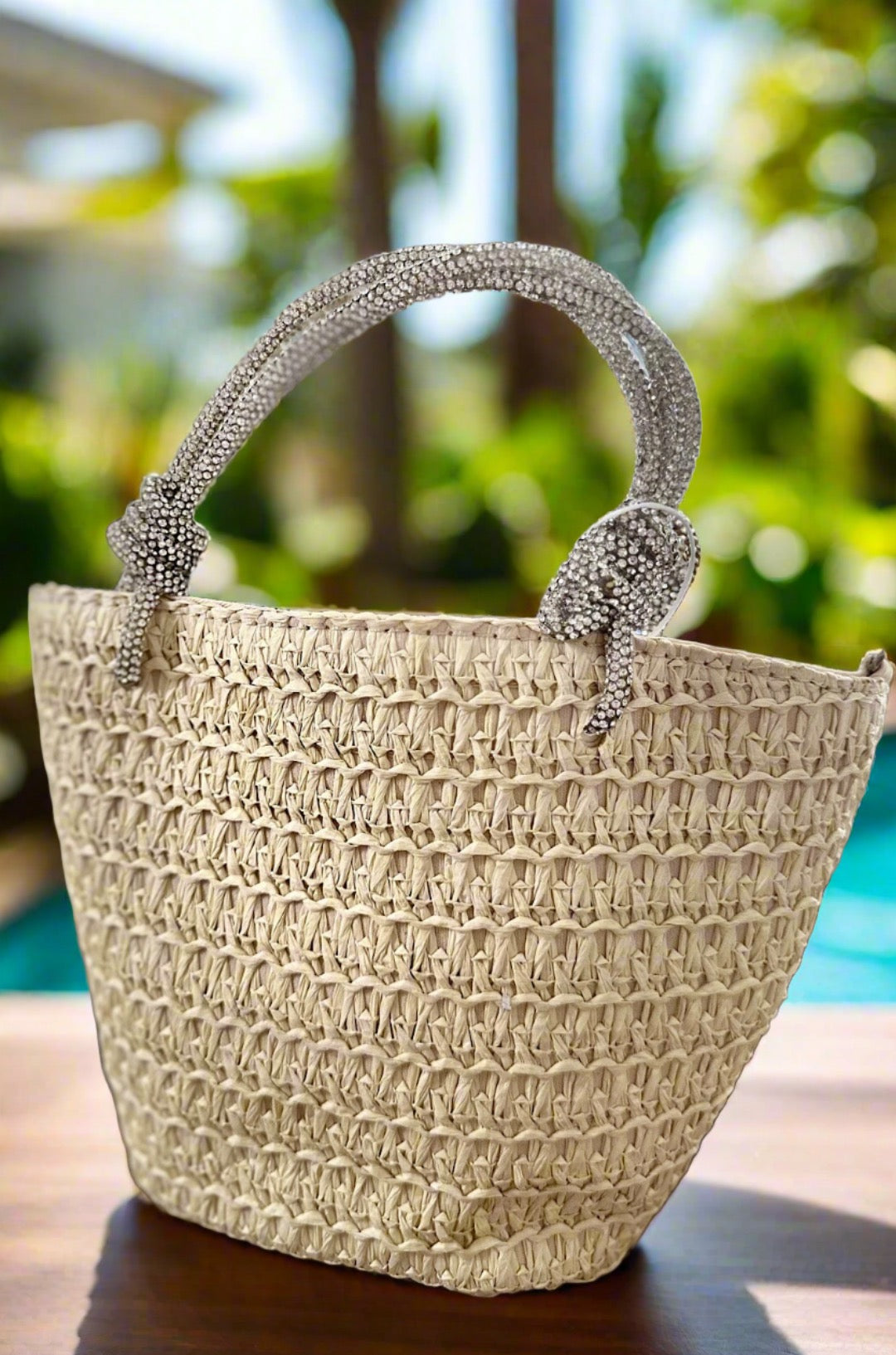Exterior Details: Woven Straw, Rhinestone Knotted Top Handle, Silver Hardware,