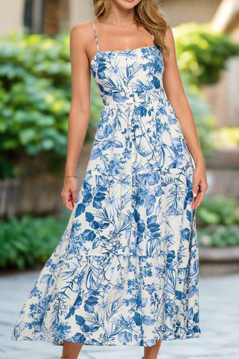 Embrace romance in this ethereal midi dress. The square neckline and adjustable straps flatter your figure, while the cascading tiers create a mesmerizing movement with every step. The elegant tie back adds a touch of unexpected drama, perfect for a spring garden party or a romantic evening under the stars.