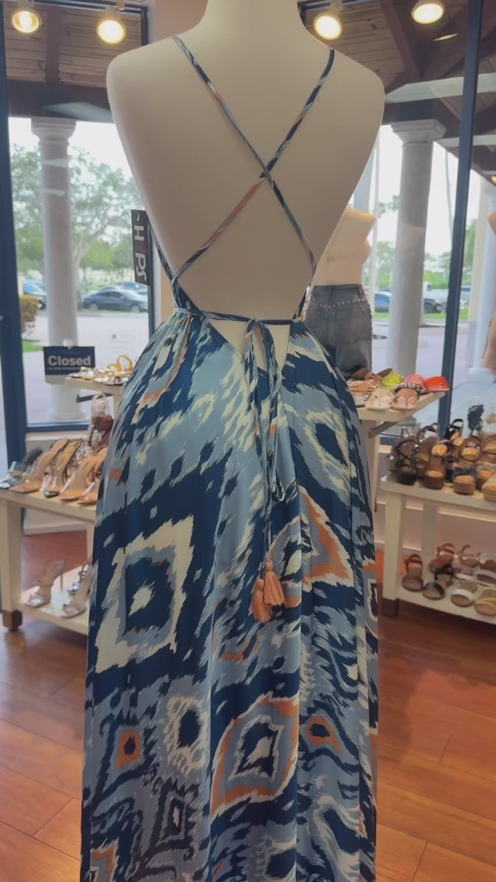 This gorgeous Geometric Halter Maxi Dress is the piece you need for your cruise or beach vacay! It features a stunning geometric print that makes a bold statement. The daring halter neck and open back create a sophisticated silhouette that turns heads. A tie detail at the front waist allows for a customized fit that flatters your figure. The dress flows gracefully down to the maxi length, making a dramatic statement wherever you go.