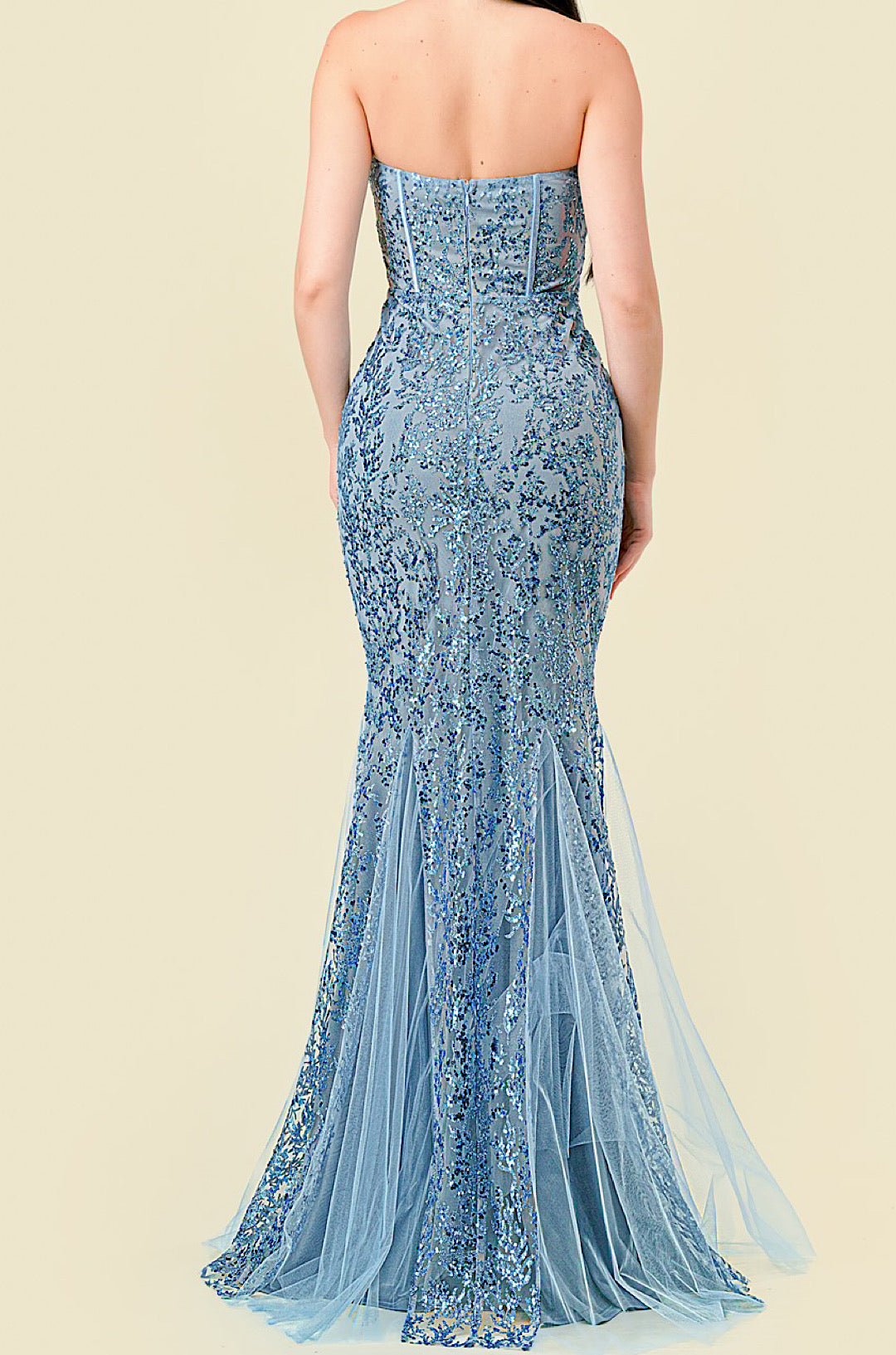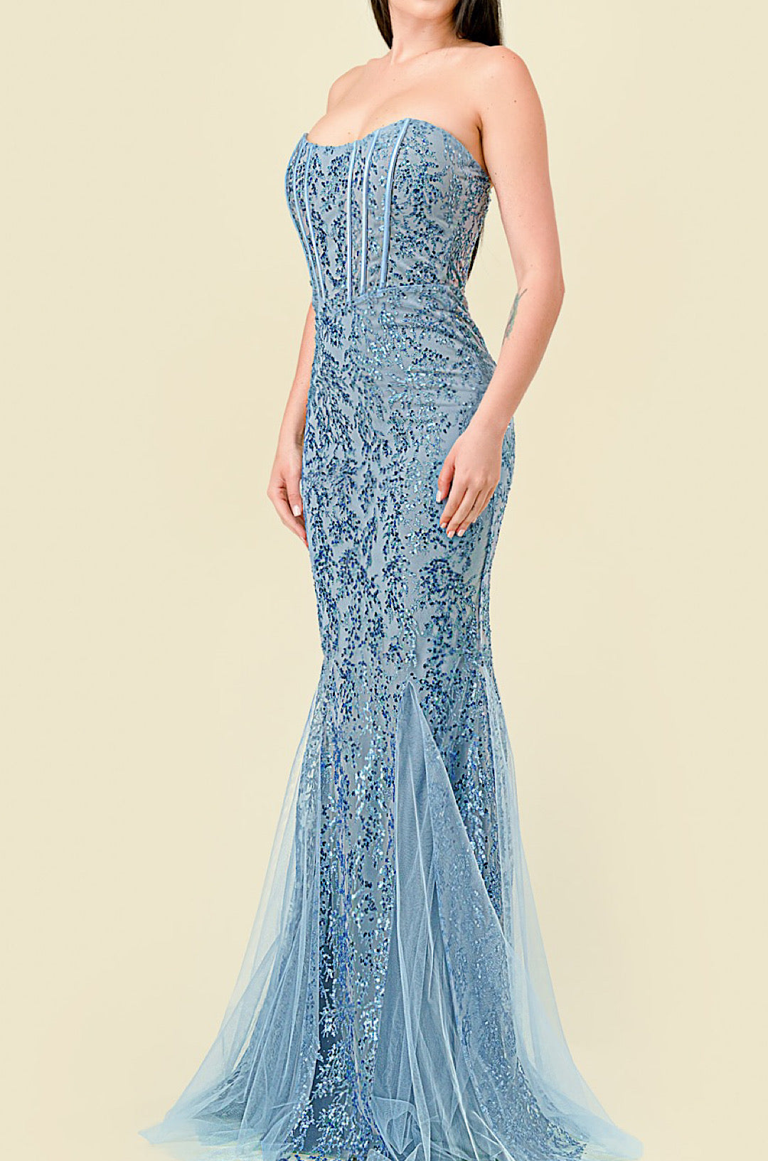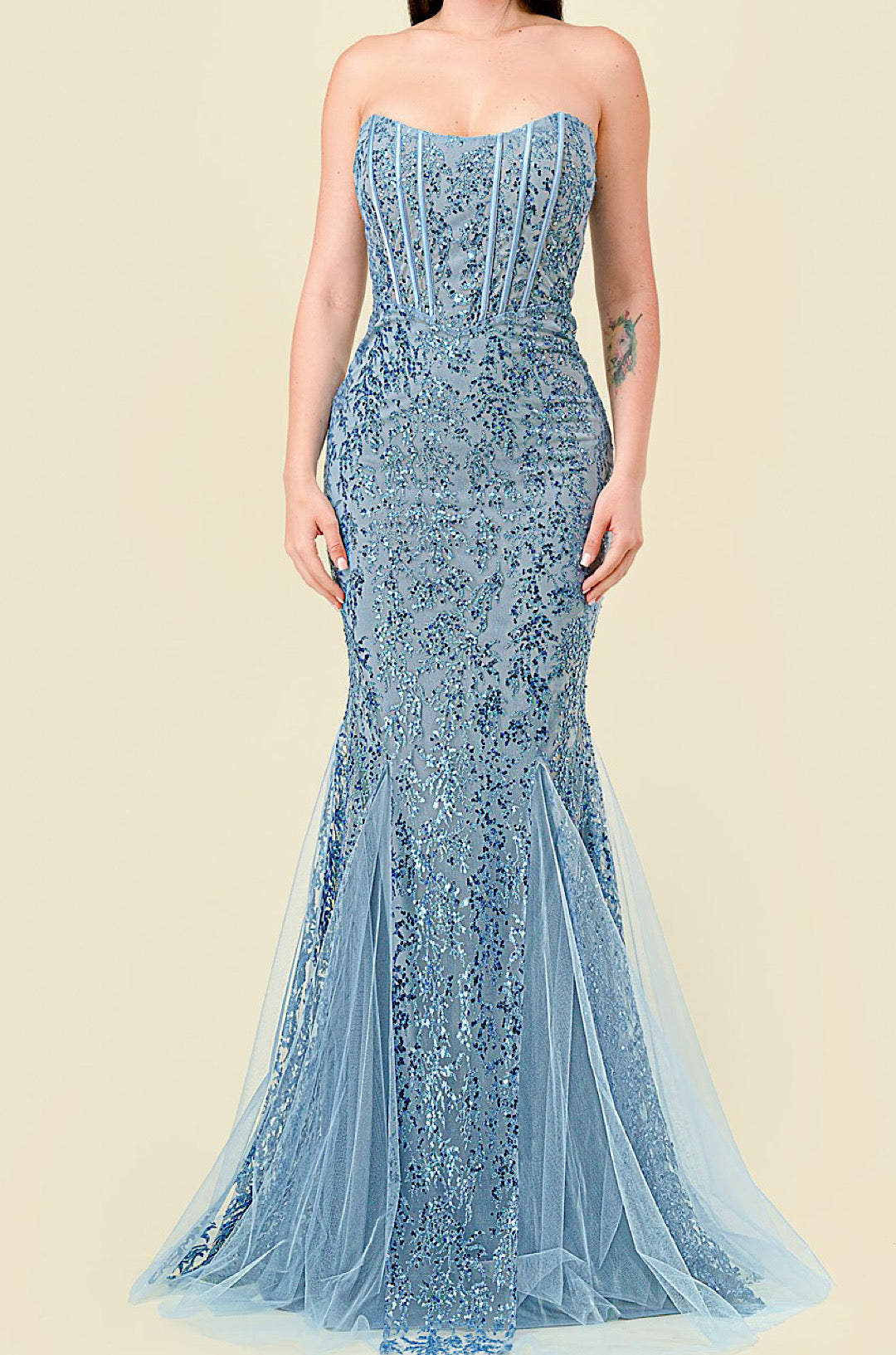 Embrace your inner starlet with this dazzling all-over glitter mermaid dress, a guaranteed showstopper for any special occasion. The romantic sweetheart neckline whispers of timeless elegance, while the fitted bodice with a flattering corset design cinches your waist for a stunning hourglass silhouette. Imagine the light catching the shimmering fabric that cascades over your entire frame – a captivating spectacle that ensures you'll be the center of attention all night long. But the magic doesn't stop there. The dress takes a dramatic turn with a flowing mermaid skirt that accentuates your curves and moves with an ethereal grace as you walk or dance. Every step becomes a captivating performance, leaving a trail of shimmering elegance in your wake. A convenient back zipper ensures a comfortable and secure fit, allowing you to celebrate and dance the night away without worry. This breathtaking dress is perfect for prom, galas, or any special occasion where you want to turn heads and leave a lasting impression. Be the envy of the room and step into the spotlight – this all-over glitter mermaid dress awaits its leading lady.