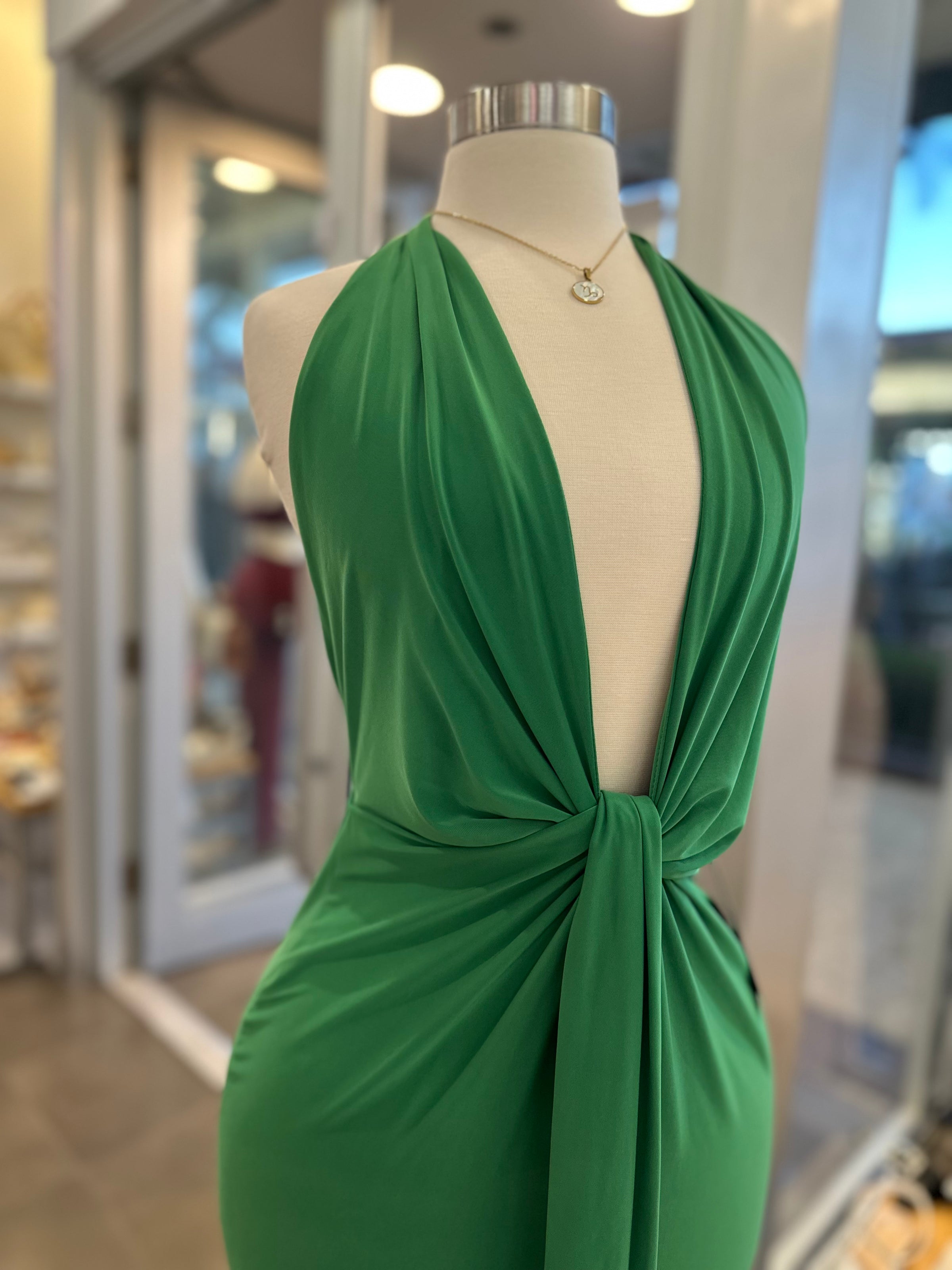 Unleash your inner goddess with this captivating maxi dress. The deep V-neckline plunges into a chic knot detail, creating a striking focal point. The halter neck and back self-tie allow for a customizable fit, while the daring front open slit adds a touch of sultry allure. The flowing silhouette ensures graceful movement, making this dress perfect for glamorous evenings and special occasions.