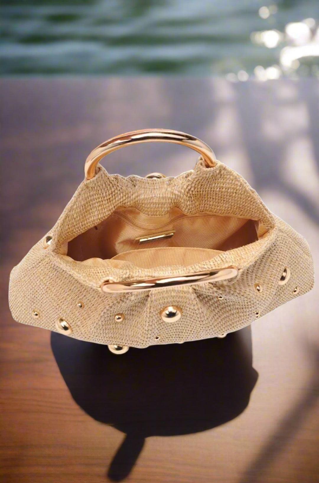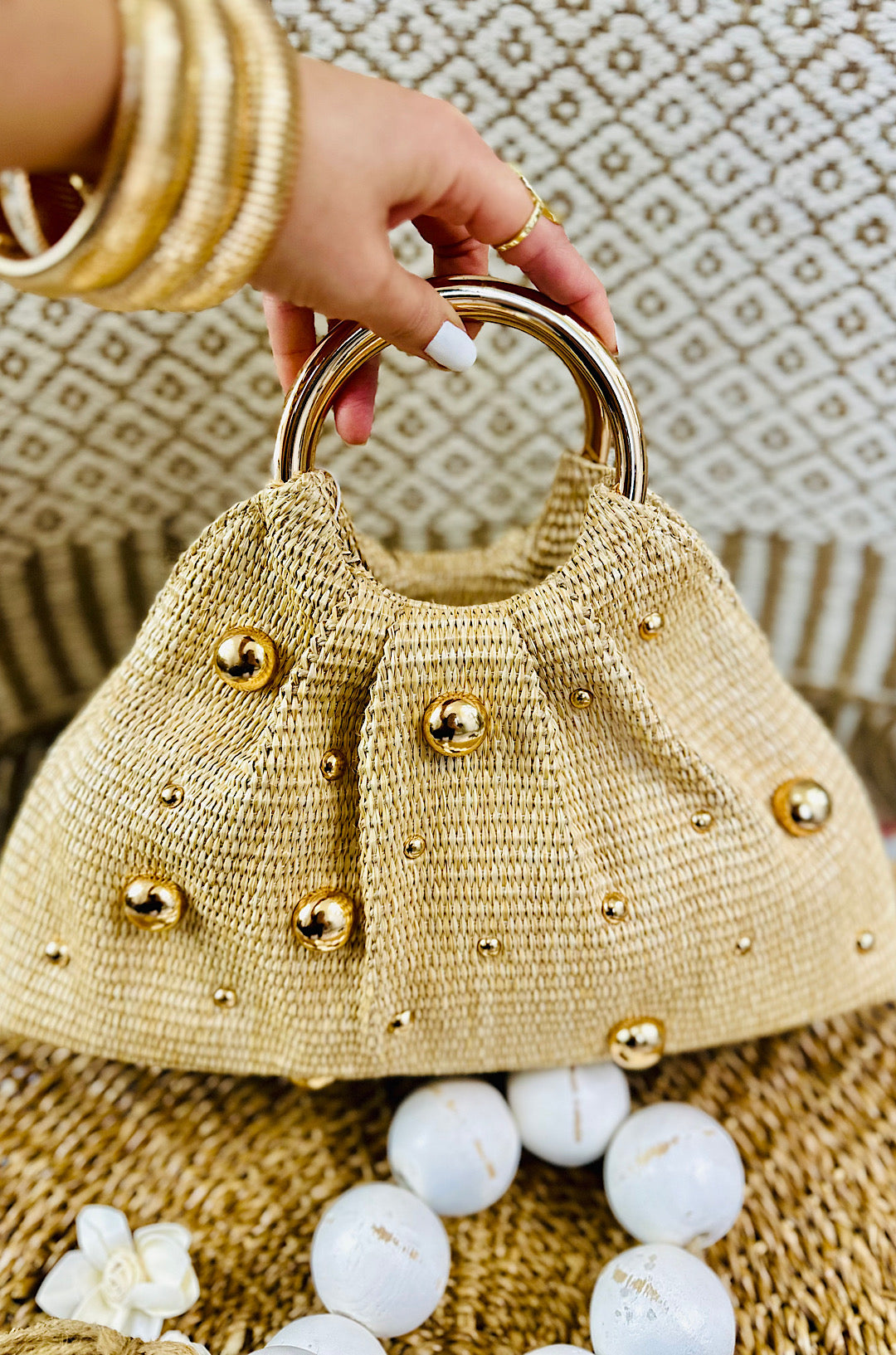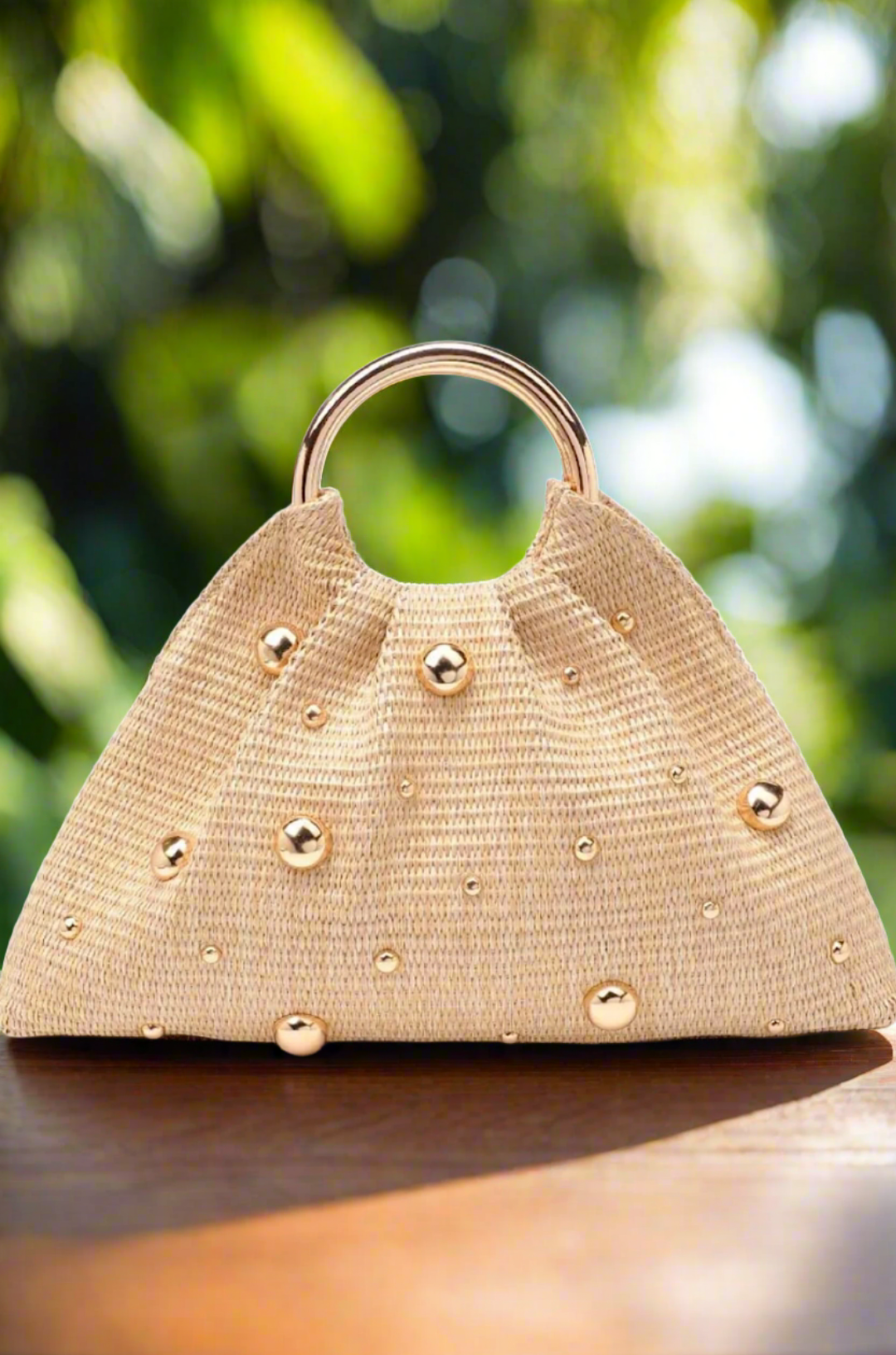 Exterior Details: Woven Design, Stud Embellishments, Round Top Handle, Gold Hardware
