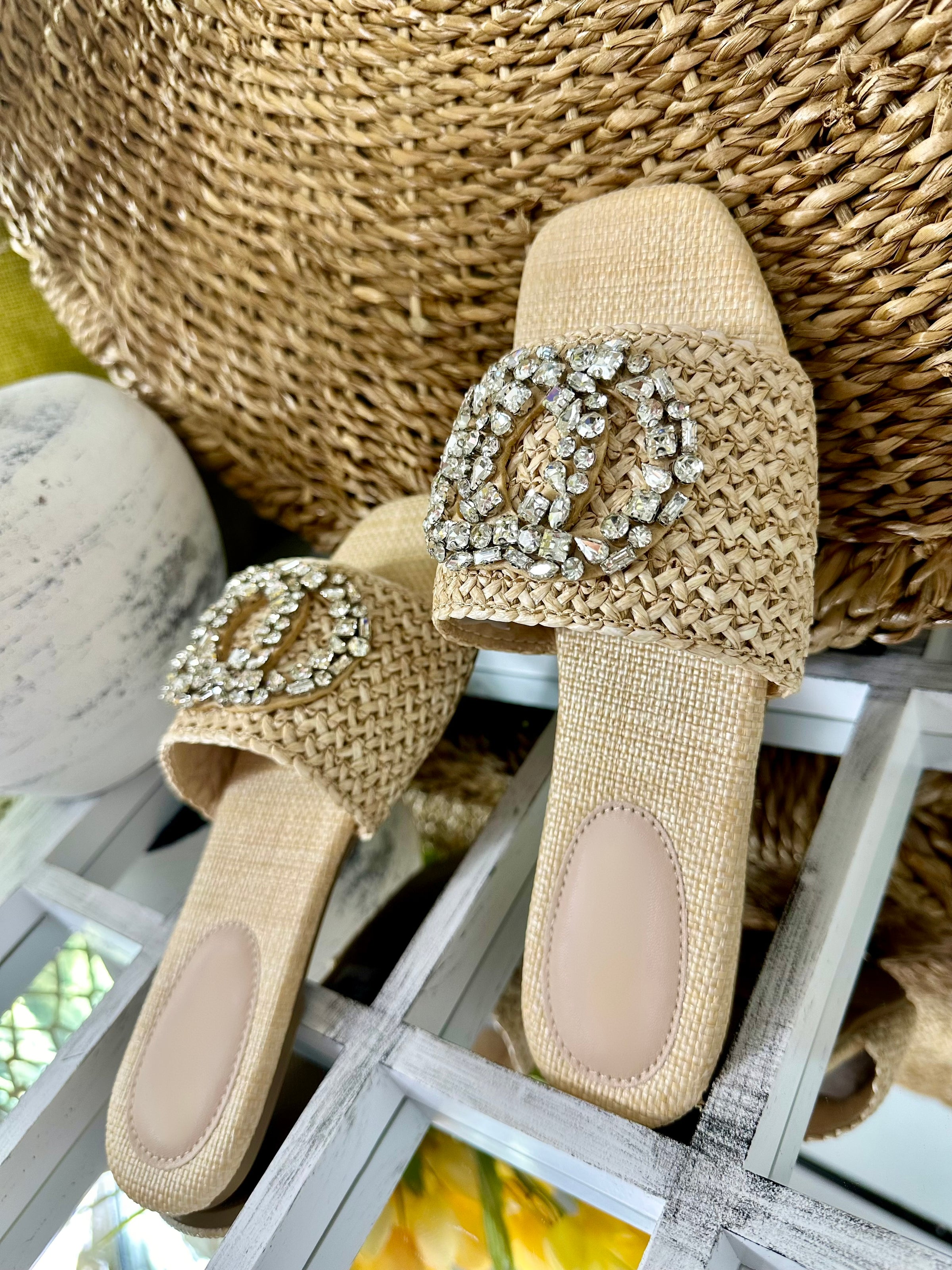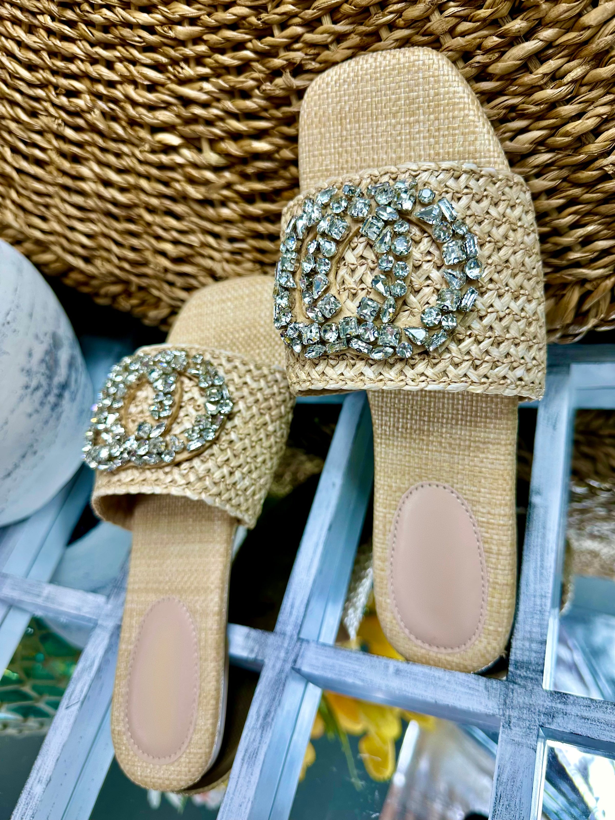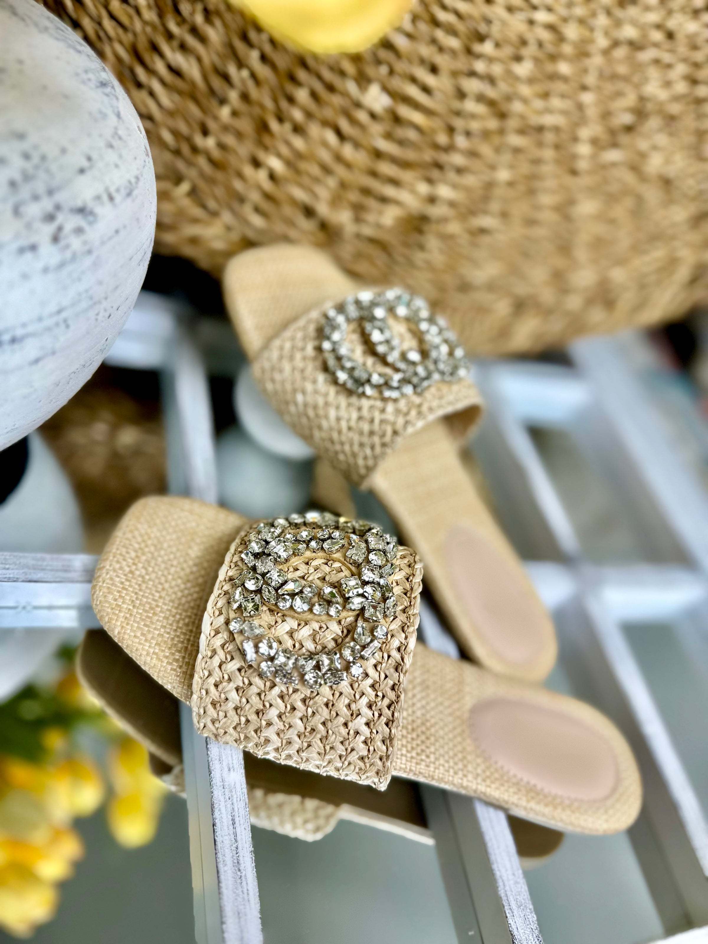 Sunshine, warm breezes, and effortless style - the Issa sandal embodies the essence of summer. Intricate woven details dance across the upper, shimmering with dazzling rhinestones that catch the sunlight with every step. Slip your feet into cool comfort with the breezy open-toe, backless design. The lightweight flat sole feels like an extension of yourself,perfect for strolling along the beach, lounging poolside, or adding a touch of glitz to your everyday adventures. The Issa sandal isn't just footwear, it's a feeling of carefree confidence and sparkling summer style.