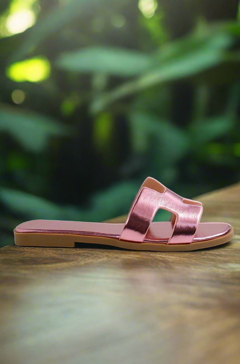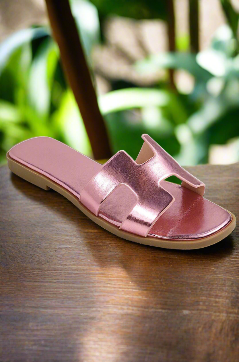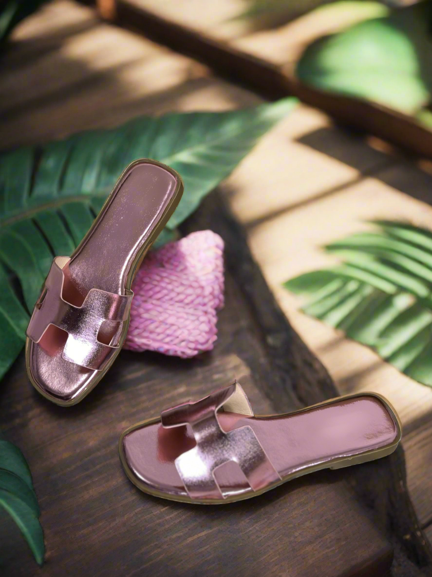 These metallic slide-on sandals have your name on them! Slip on and go, with a shimmering finish that adds instant glam to any outfit, perfect for adding a touch of understated elegance to your look.