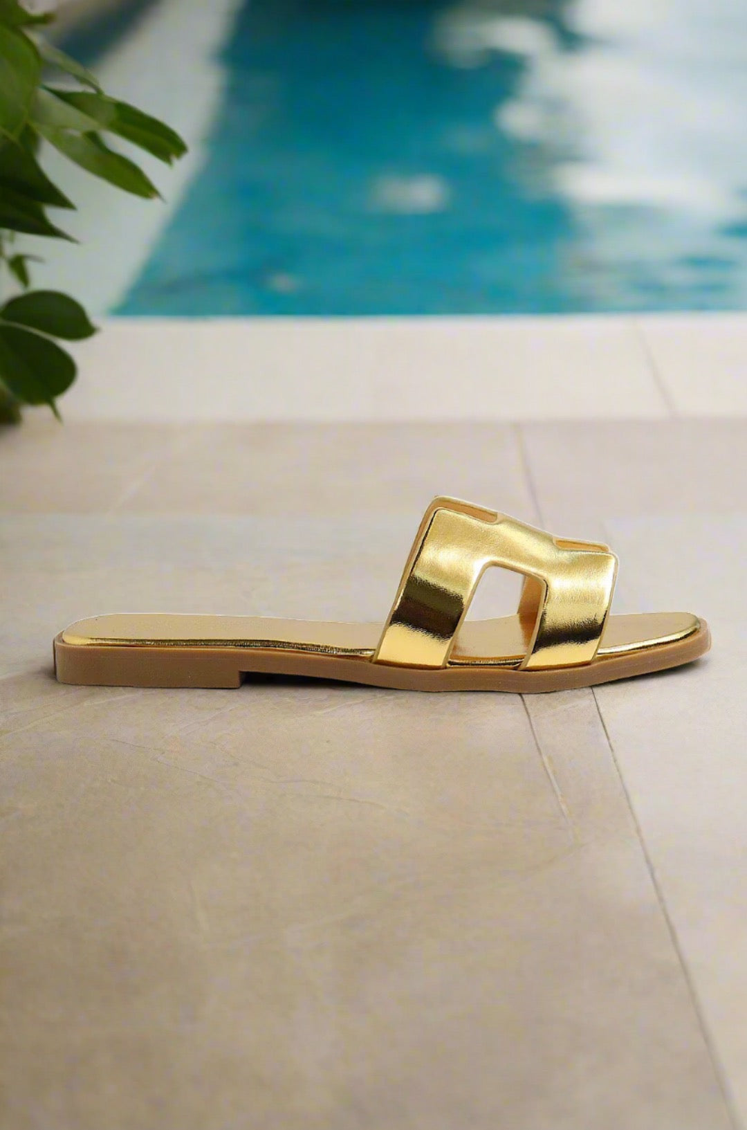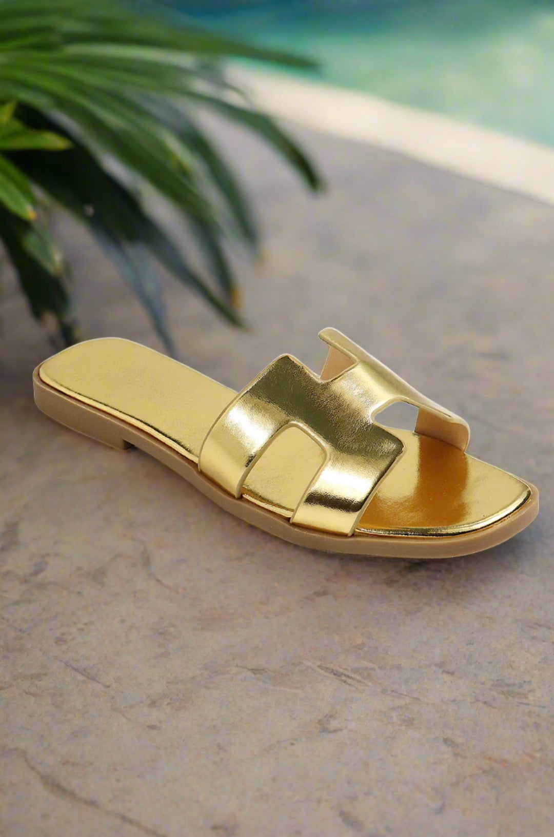 These metallic slide-on sandals have your name on them! Slip on and go, with a shimmering finish that adds instant glam to any outfit, perfect for adding a touch of understated elegance to your look.