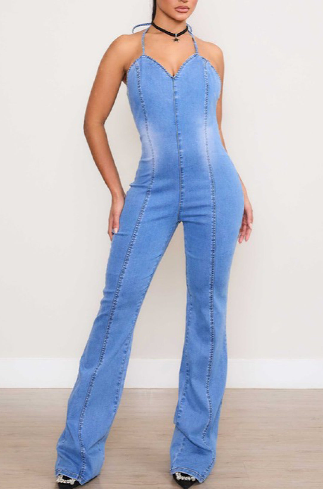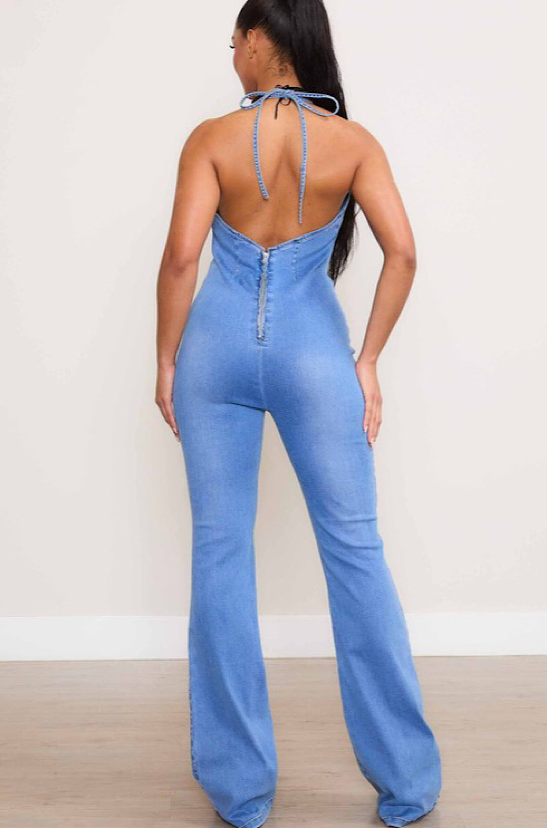A denim jumpsuit with a flattering halter neck that ties at the back for adjustability. It has a scoop back and a zipper closure in the back for easy on and off