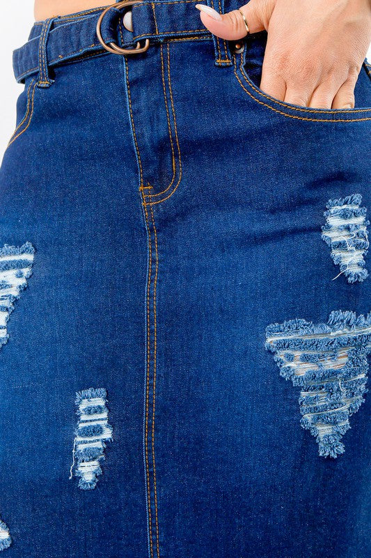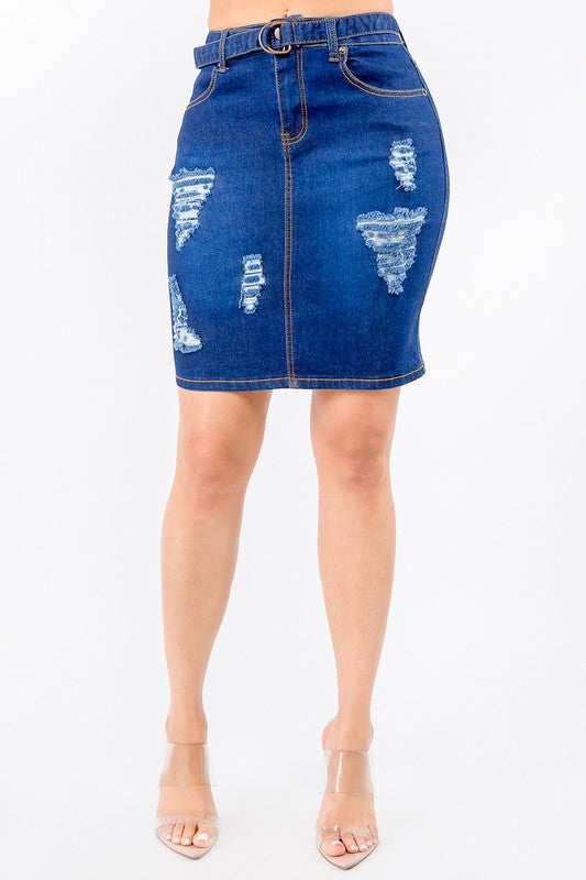 Rock your rebel spirit with this light-wash denim mini skirt, featuring edgy rips and frayed hems for a lived-in look. The denim belt cinches your waist for a flattering silhouette, while the brown buckle adds a touch of shine. Pair it with a graphic tee and sneakers for a laid-back vibe, or dress it up with a blouse and heels for a night out.