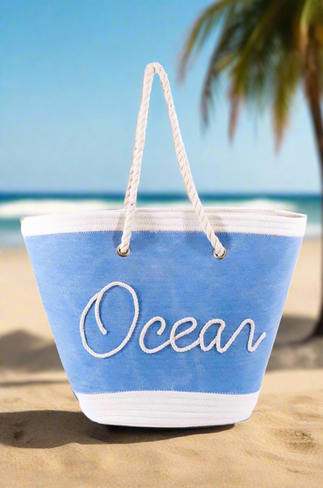 Carry your love for the ocean wherever you go with this delightful beach bag. Crafted in a calming sky blue hue, it evokes the serenity of gentle waves lapping against the shore. The word "Ocean" is lovingly embroidered on the front,adding a touch of personality and perfectly capturing your beach bum spirit. This bag isn't just about looks though; it's built for ultimate beach days. Spacious enough for all your essentials, from towels and sunscreen to snacks and drinks, it ensures you're prepared for a day of fun in the sun. So pack your worries away and grab this beach bag – adventure awaits!