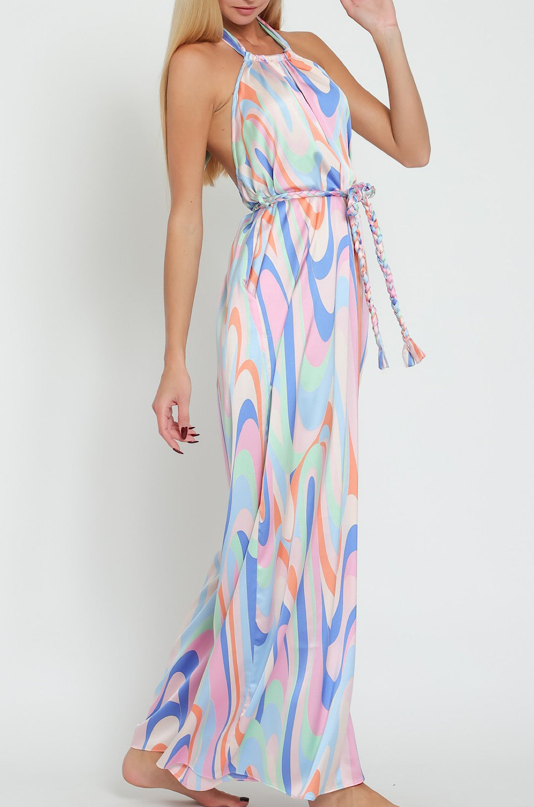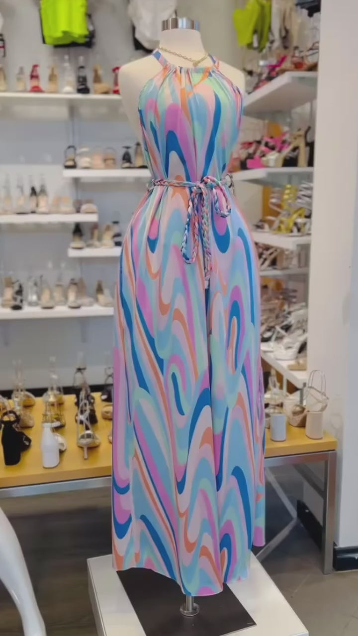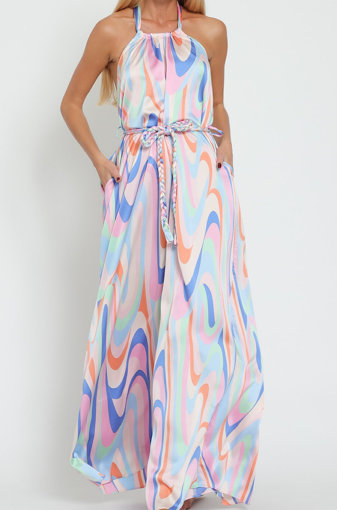 Embrace head-turning style with this captivating jumpsuit. The alluring halter neckline draws attention to your shoulders and beautifully frames your décolletage, while the daring open back adds a touch of sophisticated seduction. Intricate braided detailing adorns the bodice, creating a unique and eye-catching texture. Define your waist and elongate your silhouette with the flattering self-tie belt. This jumpsuit offers both comfort and style, making it perfect for a night out, a special occasion.
