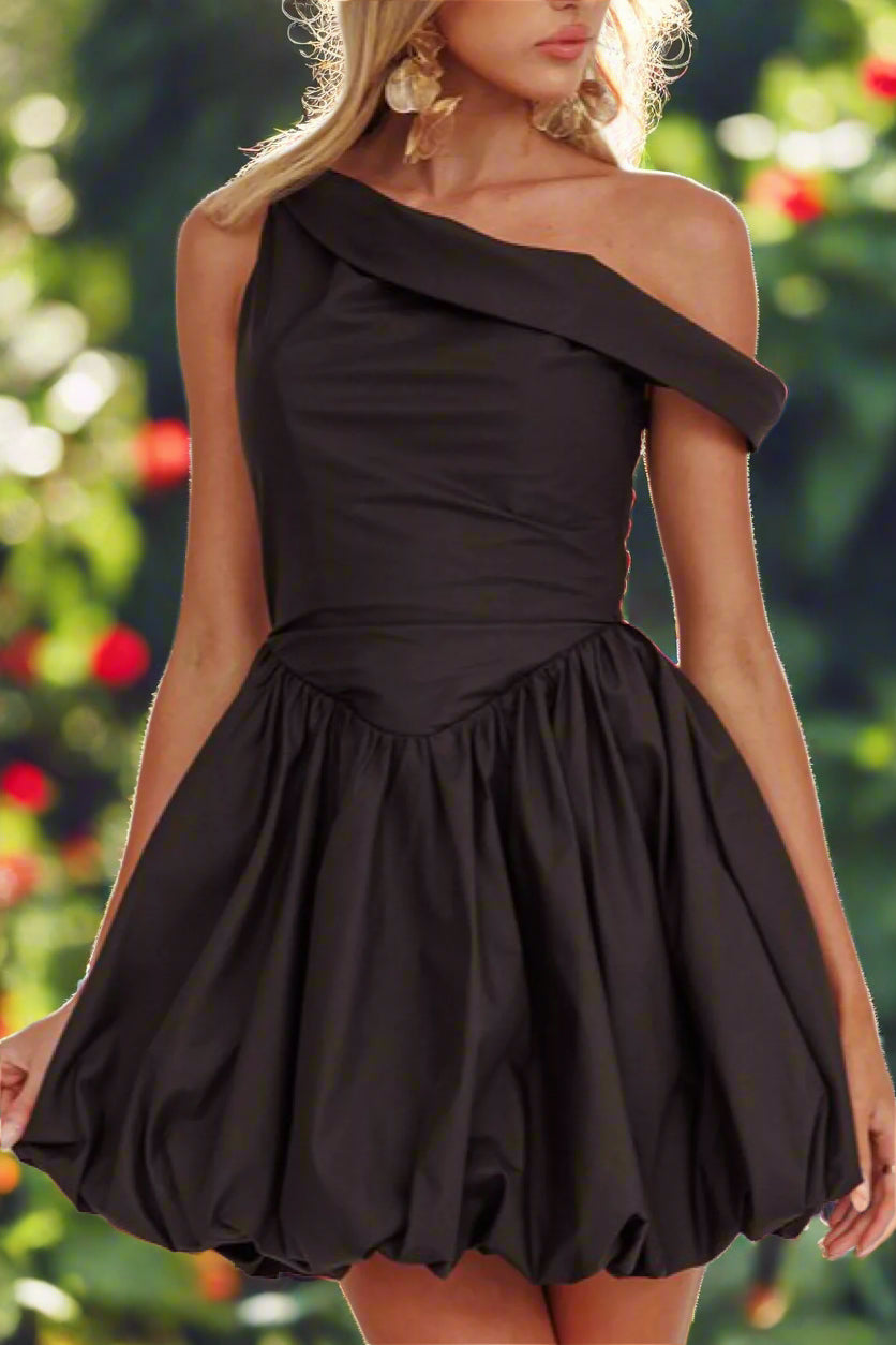 Experience the effortless chic of this one-shoulder mini dress. The unique bubble hem creates a playful and flattering silhouette, while the concealed back zipper ensures a smooth and comfortable fit. This versatile dress is perfect for a variety of occasions