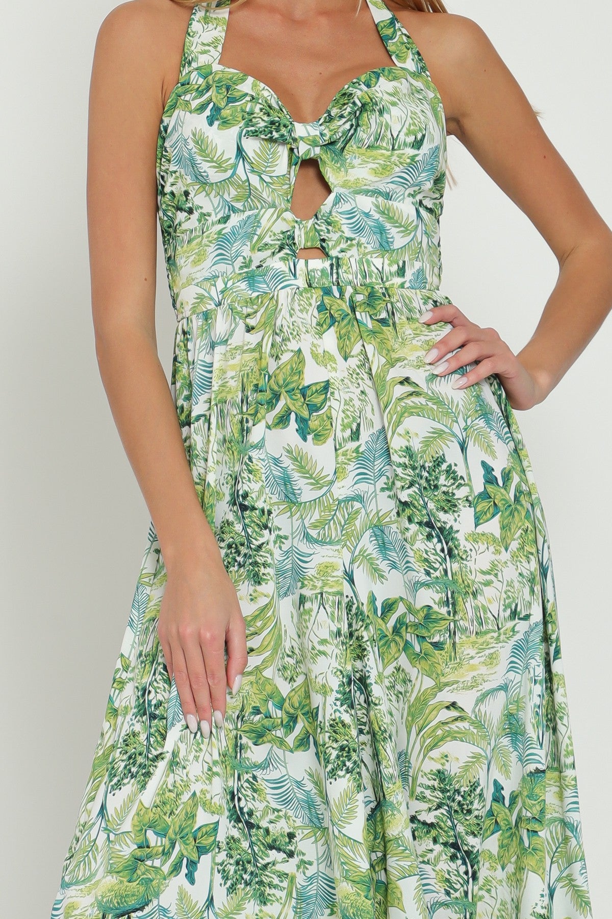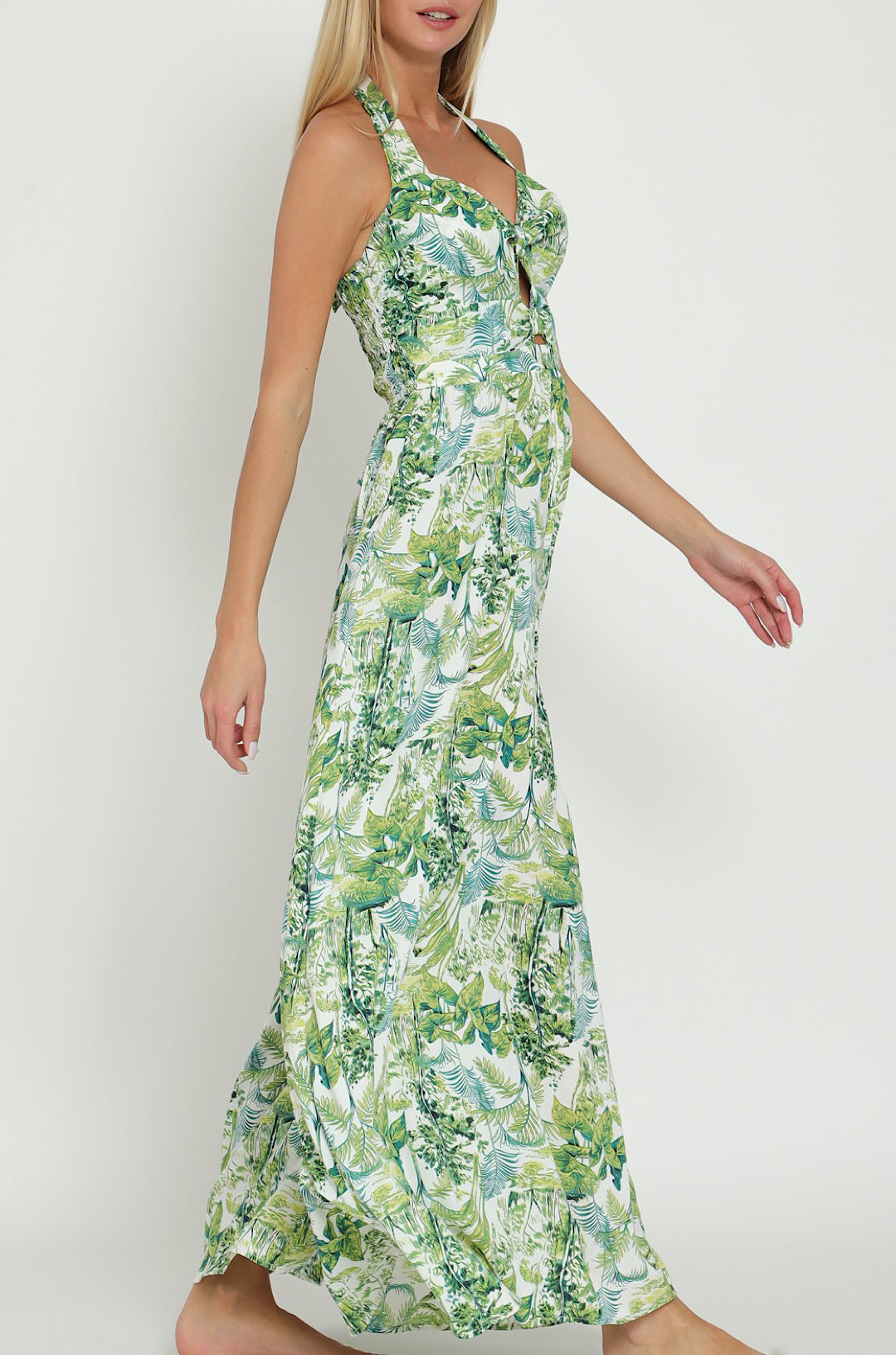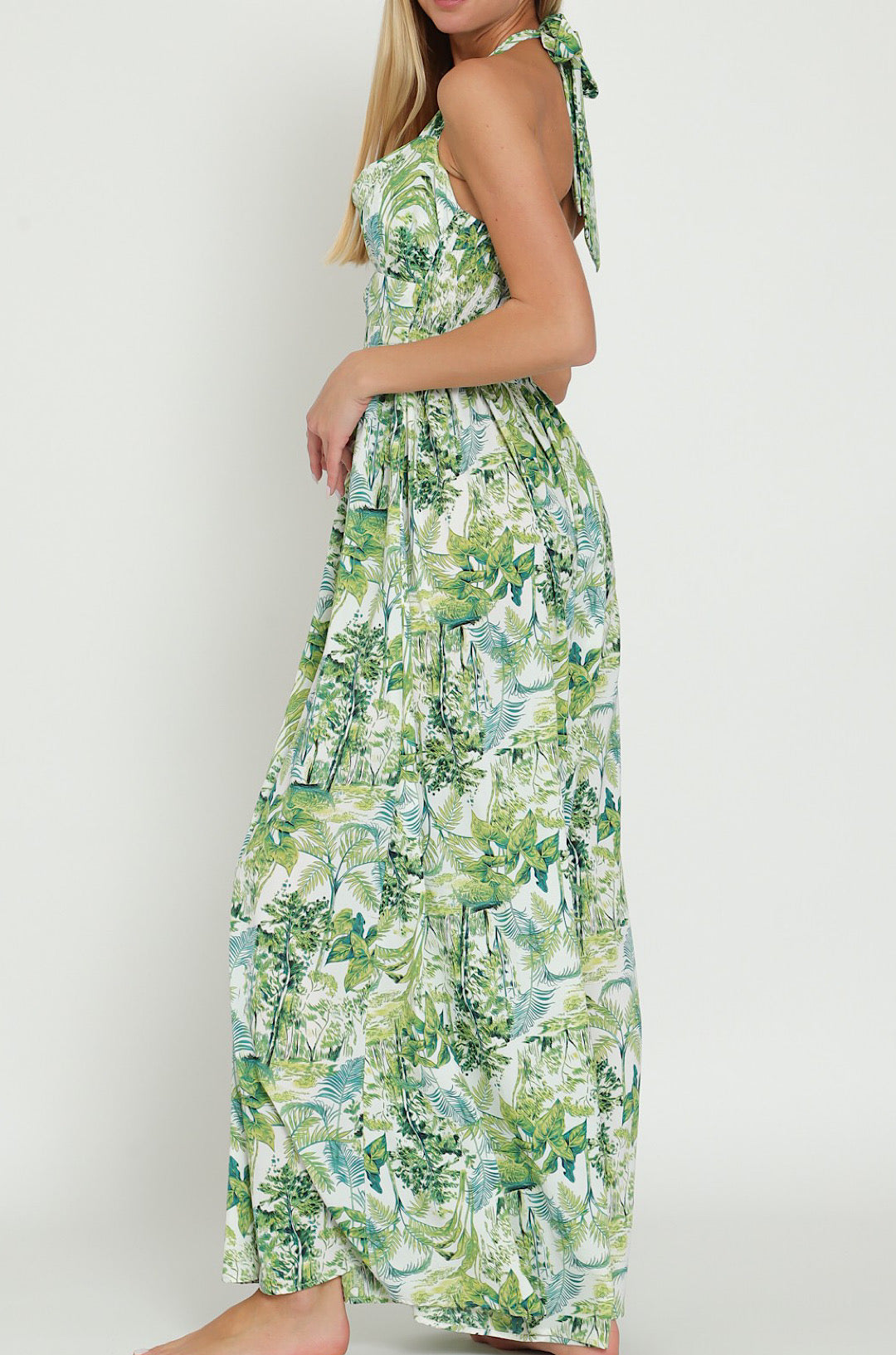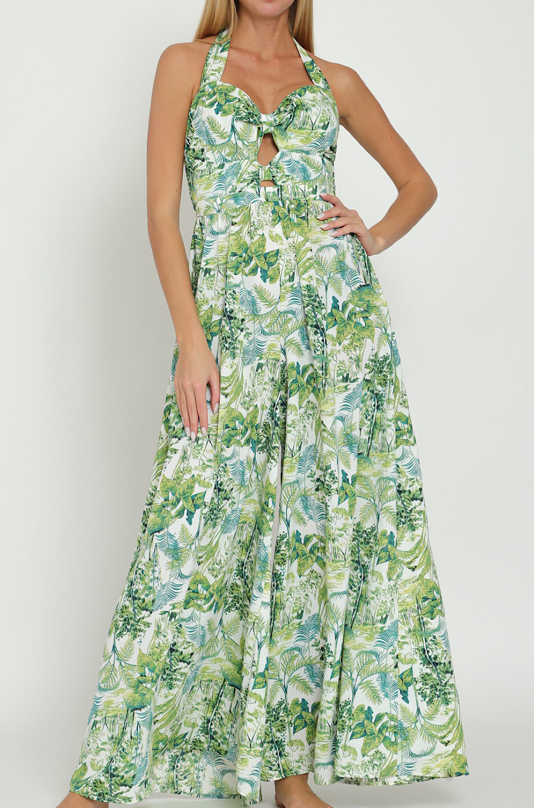 This stunning jumpsuit is the epitome of warm-weather chic. Featuring a flattering halter neckline with a trendy cut-out detail, it draws the eye and complements your figure. The smocked bodice creates a comfortable and forgiving fit, while the wide-leg pants add a touch of elegance and flow. The vibrant palms print injects a touch of spring/summer flair, making it perfect for any occasion, from a stylish brunch to a glamorous cruise or a relaxing vacation. Pair this jumpsuit with a statement piece from our stunning bag collection for added personality. For a touch of height and effortless elegance, slip on a pair of our comfortable wedges and you're ready to explore your vacation destination in style!