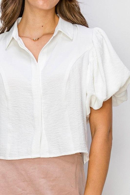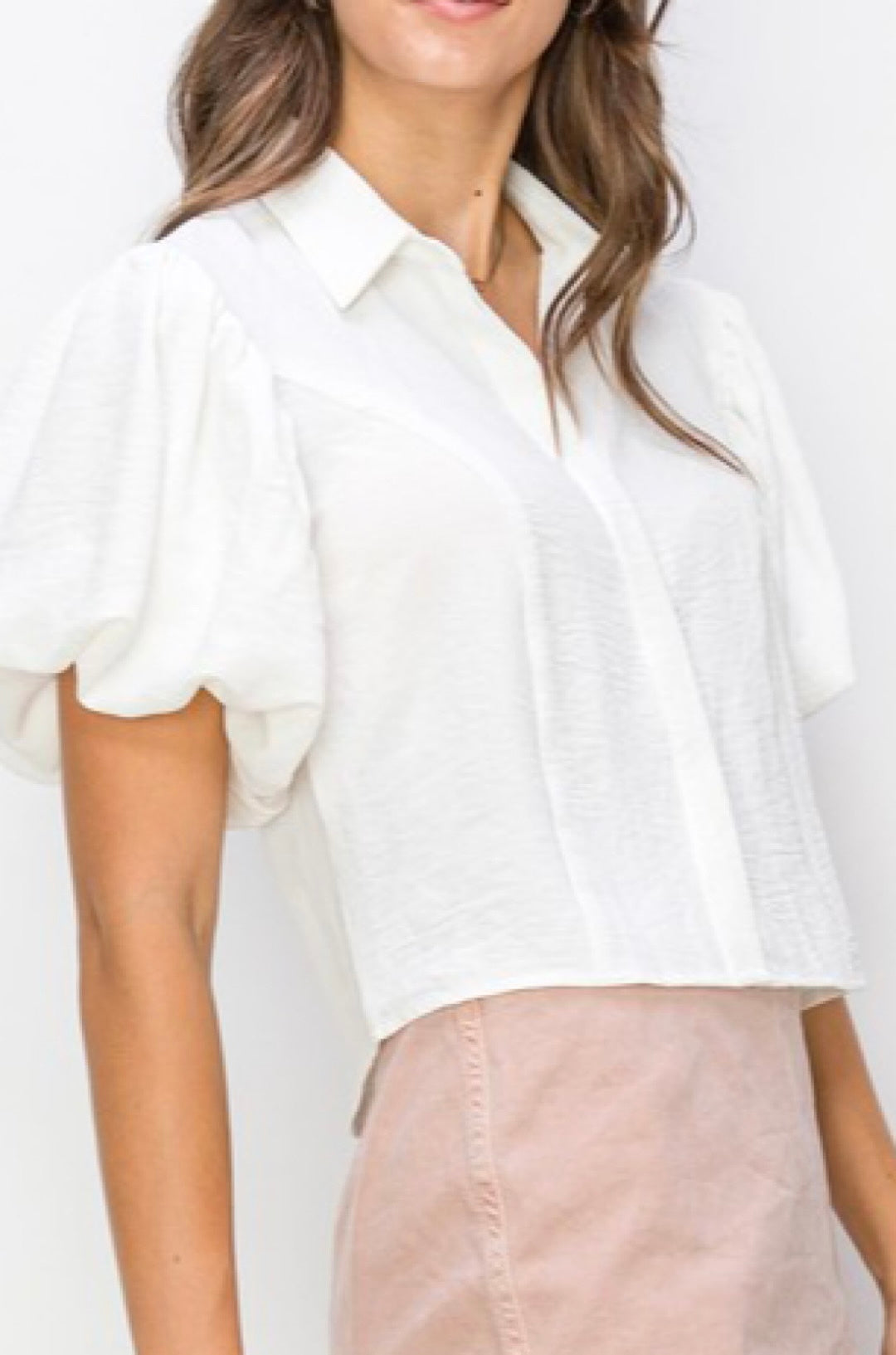 Twirl with confidence and a touch of whimsy in the Parisian Dream Blouse. This charming blouse boasts a crisp point collar that frames your face beautifully. The slightly cropped bodice creates a flirty silhouette that flatters your figure. With a cleverly concealed button placket for a clean, minimalist look, this blouse is all about the details. The short balloon sleeves add a playful touch and a hint of vintage inspiration. Whether you're on a romantic date night or a fun brunch with friends, this blouse is sure to make every moment one to cherish.