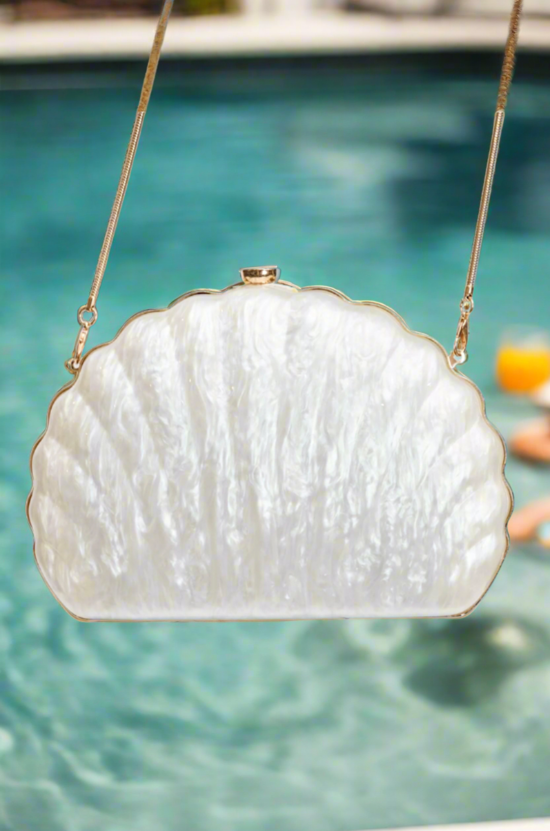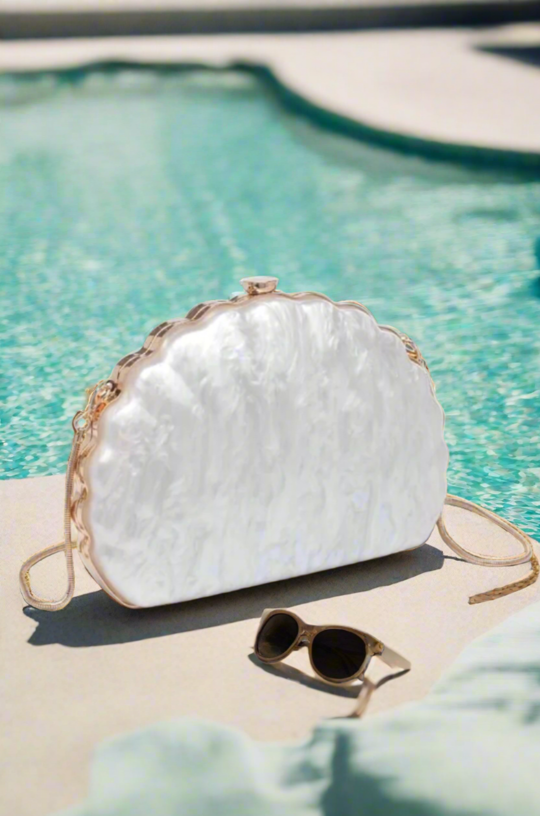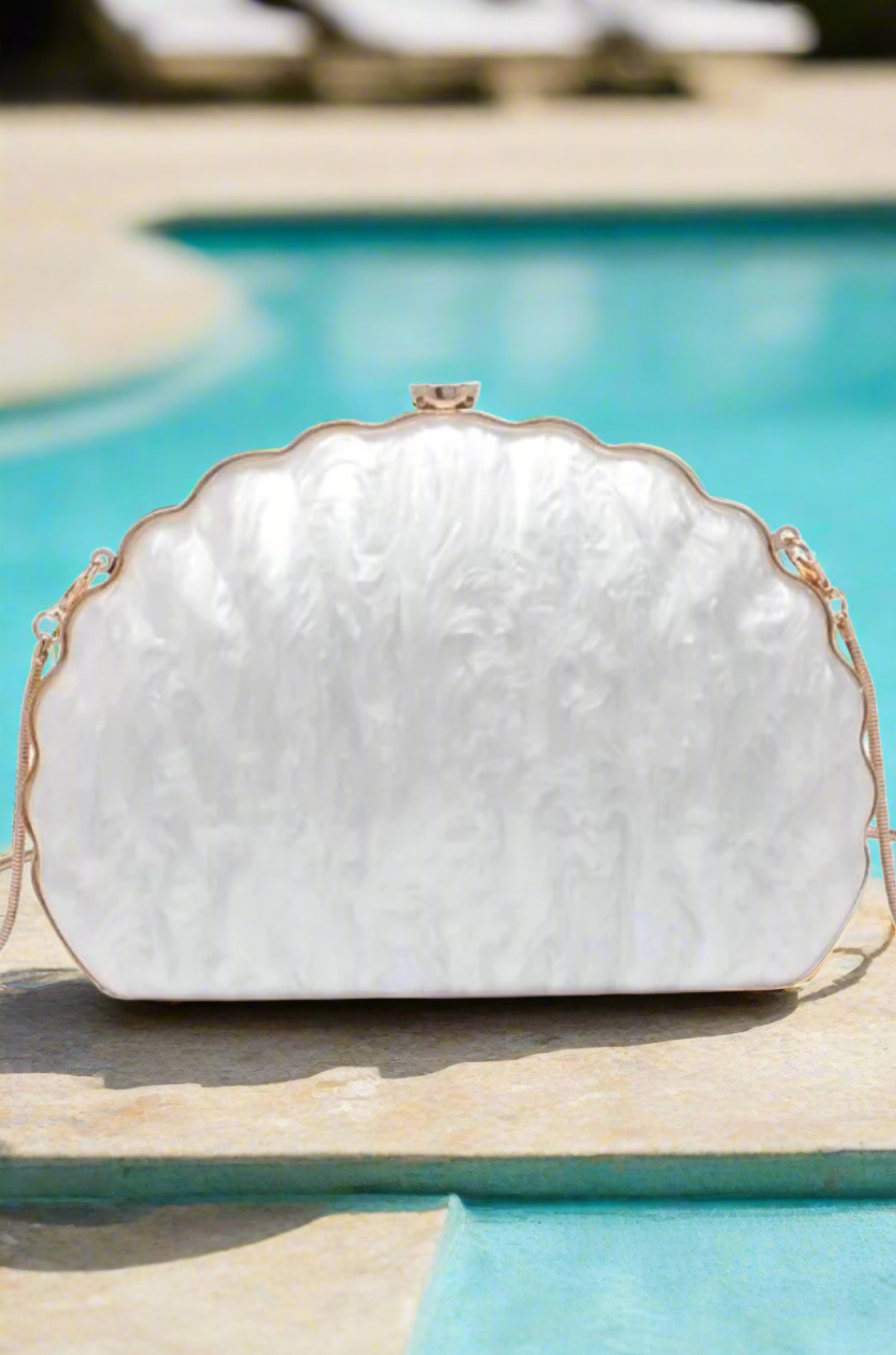 Dive into the enchantment of the night with our Evening Bag. The top clasp opens to reveal a unique shell-shaped marbled design, accompanied by gold hardware and a detachable chain strap. Inside, a fabric-lined interior awaits, blending sophistication with a touch of whimsy.