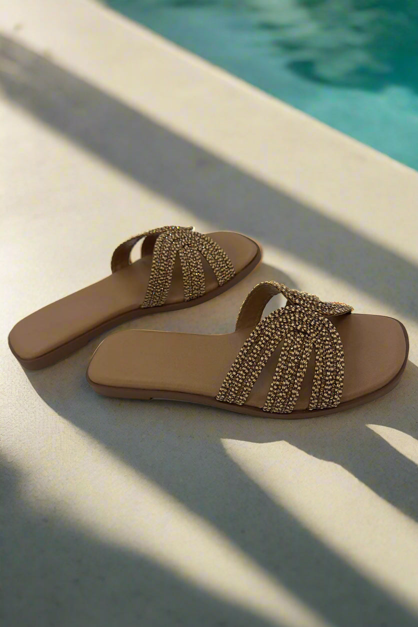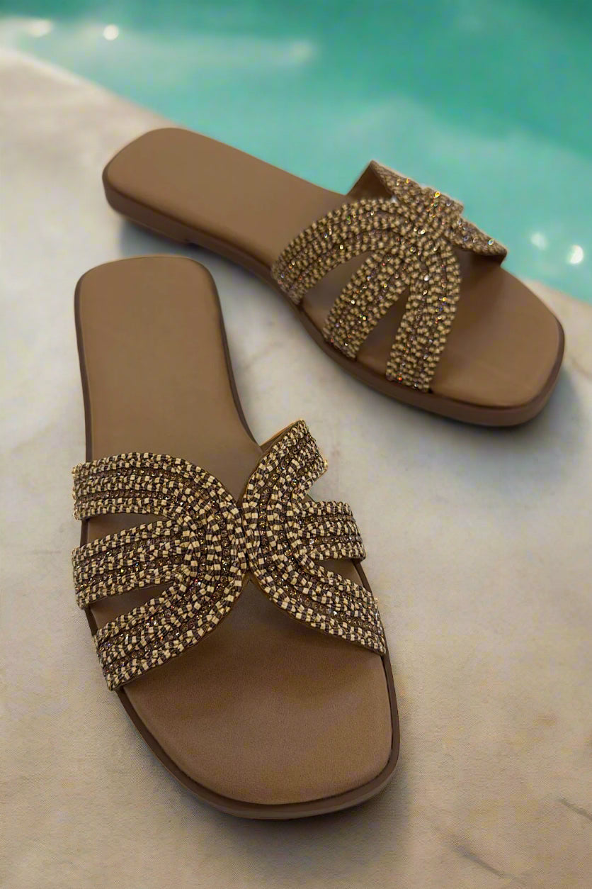 Add a touch of sparkle to your step with these open-toe slide sandals. Featuring a fabric upper adorned with dazzling rhinestones, these flat sandals offer both comfort and style. Perfect for warm-weather days, these slides are easy to slip on and elevate any casual look.