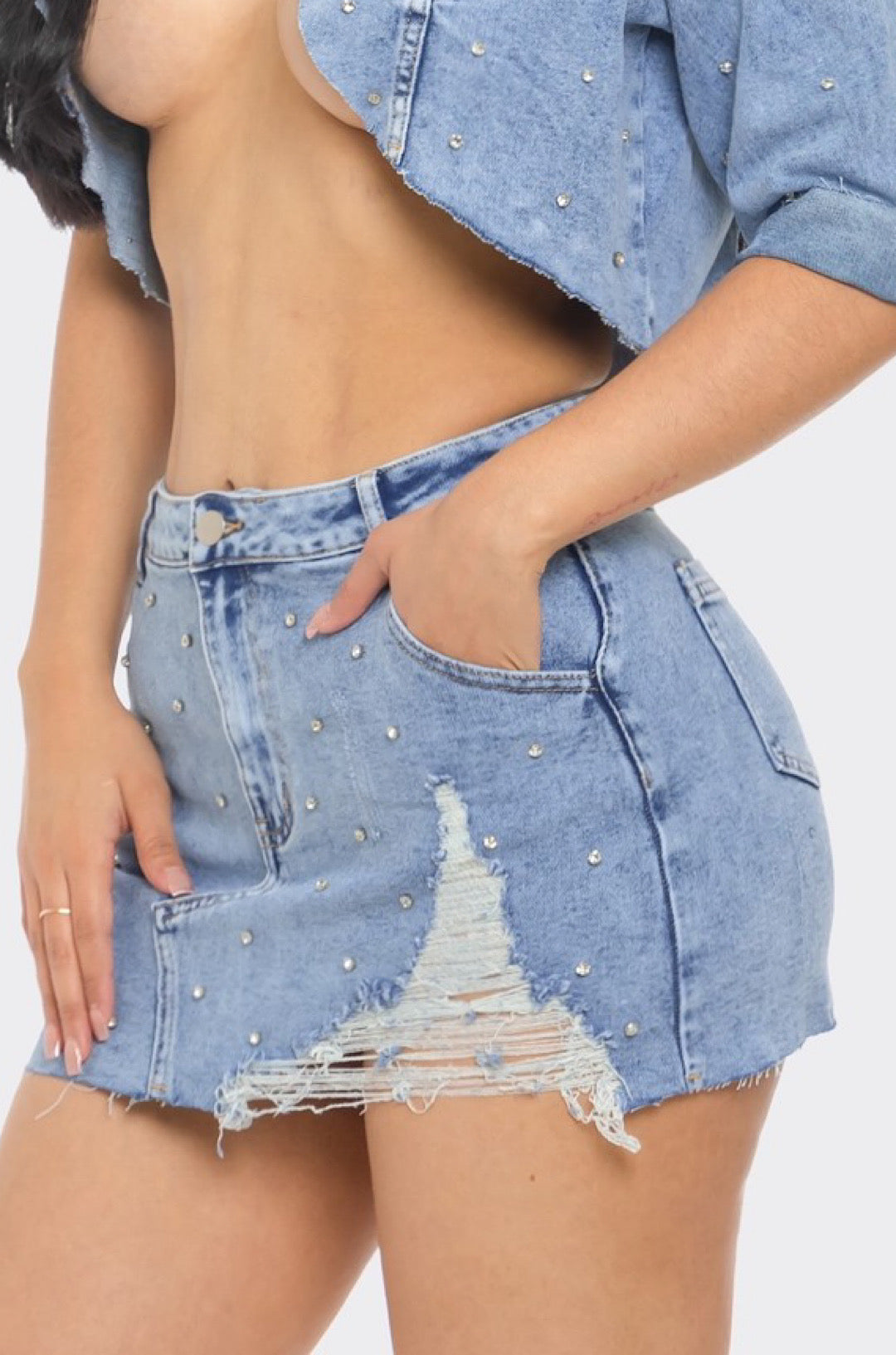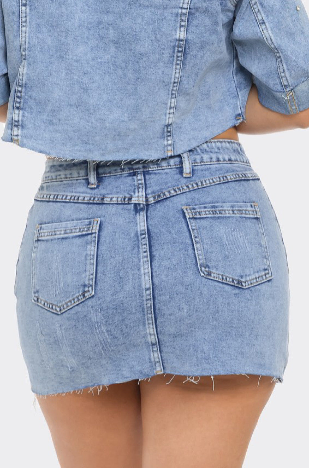 Complete your rockstar-inspired look with this edgy distressed mini skirt! The cool  light blue denim echoes the jacket, featuring a perfectly distressed finish for a touch of lived-in flair. The stretchy denim ensures all-day comfort and flatters your curves, while the frayed hem adds a trendy detail. This skirt is perfect for showing off your legs and creating a effortlessly cool vibe. Pair it with the matching cropped denim jacket for a complete look, or mix and match with other tops for endless outfit possibilities.