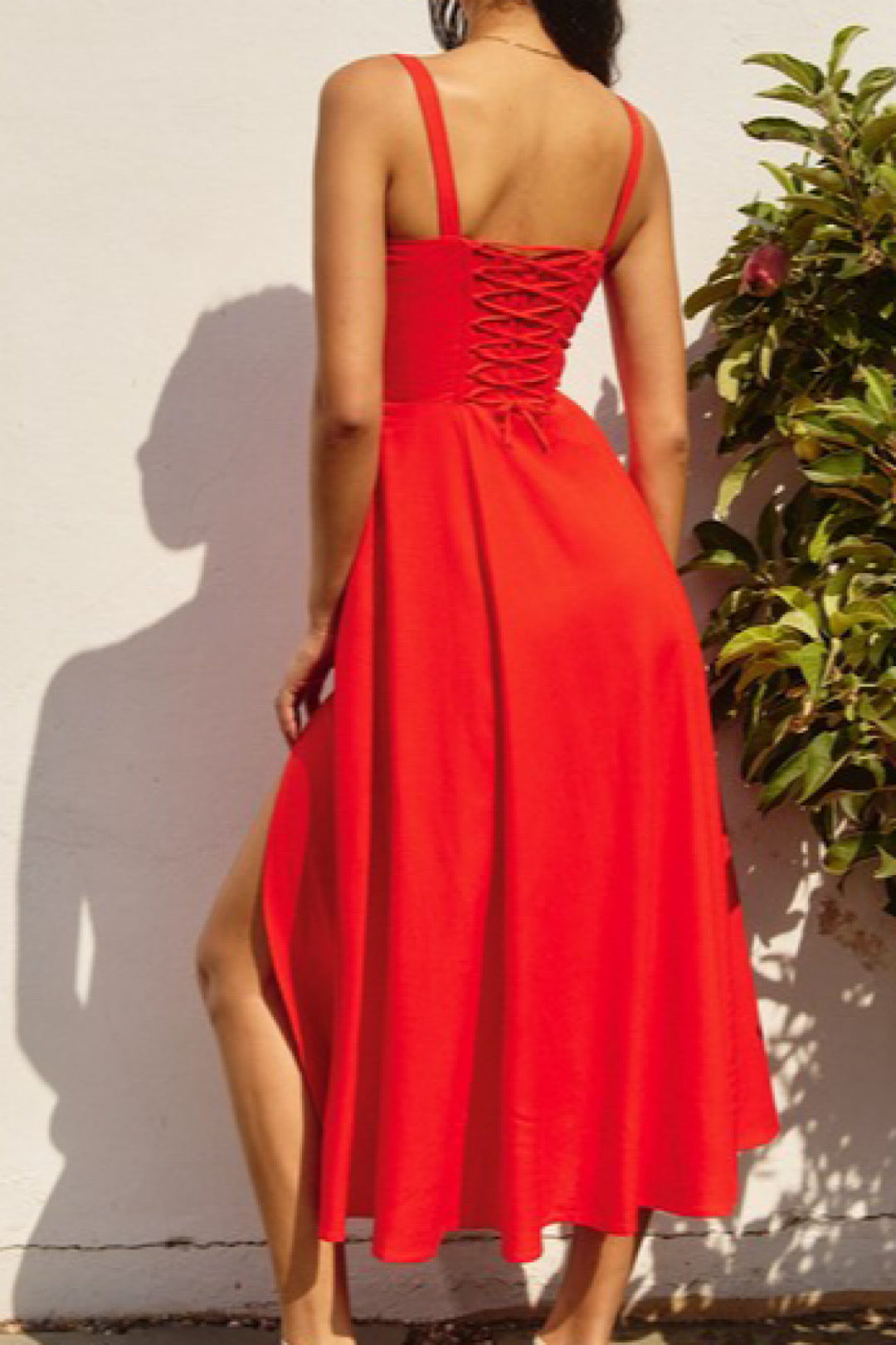 Embrace effortless elegance in this captivating linen-cotton blend midi dress. Featuring a romantic sweetheart neckline with drawstring fastening and a keyhole detail, a corset-inspired bodice, and cinching lace-up closures on the back, this dress is both alluring and comfortable. The chevron waist detail accentuates your curves, while the fit-and-flare silhouette creates a flattering silhouette.