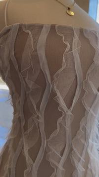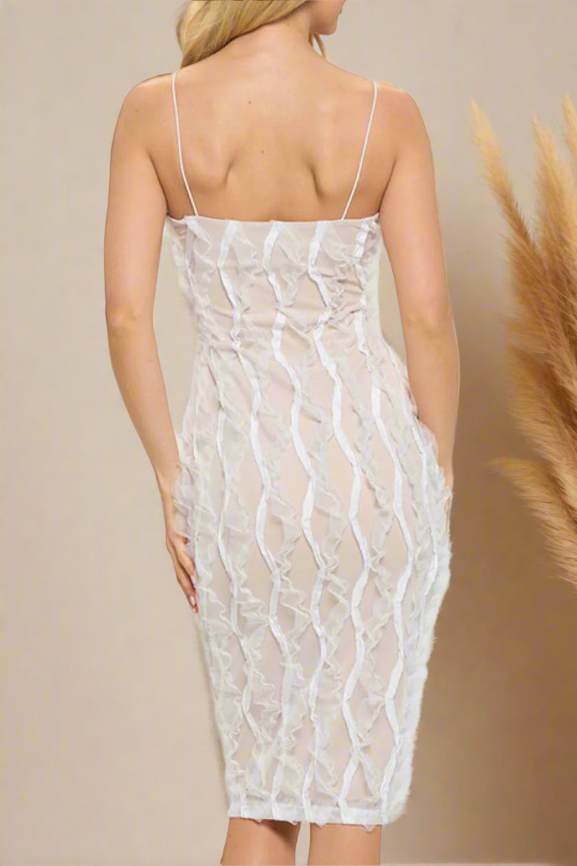 Embrace modern femininity with this powder mesh bodycon midi dress. The square neckline and delicate bungee shoulder straps create a contemporary silhouette, while the wavy ruffles and mesh detailing add a touch of ethereal charm. The flattering bodycon fit is enhanced by a full lining for comfort and coverage. This dress is perfect for making a statement at any special occasion.