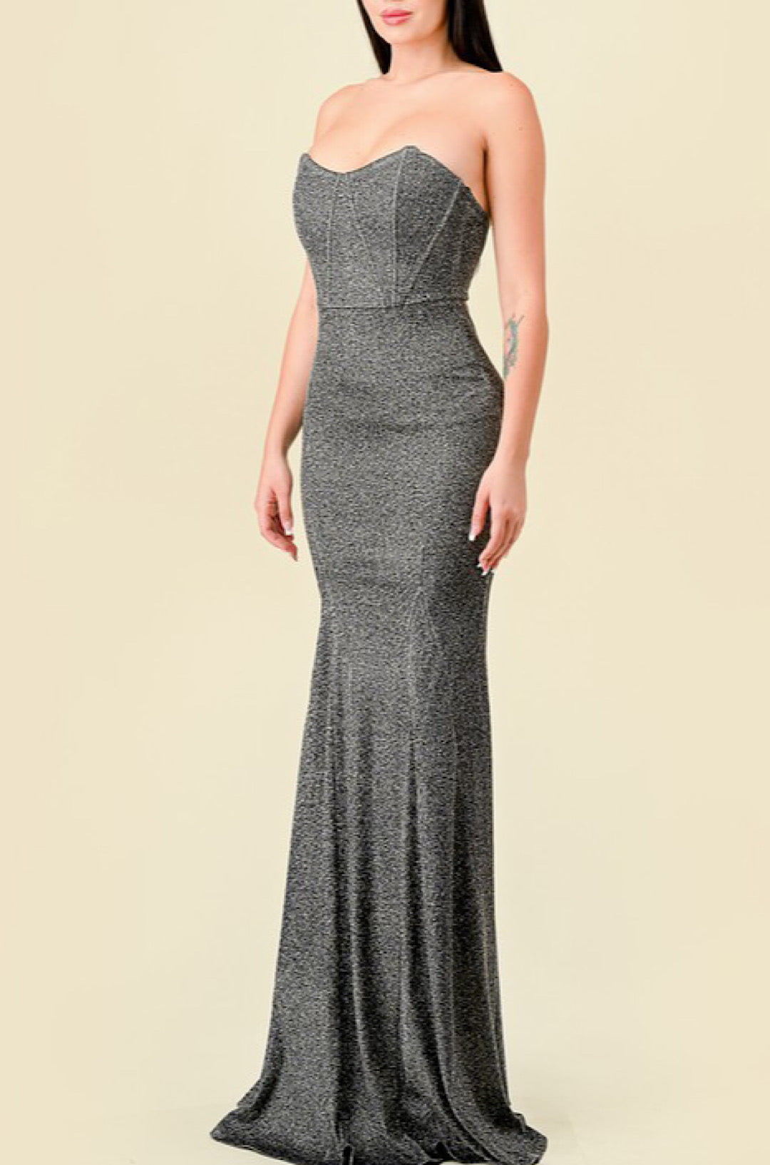 Radiate confidence and elegance at your next special event in the Solid Strapless Glitter Corset Maxi Dress. This show-stopping gown boasts an all-over glitter finish that shimmers under the lights, making you the center of attention. The strapless sweetheart neckline flatters your figure, while the boned bodice sculpts your curves and cinches your waist for a stunning hourglass silhouette. The princess-seamed high-waisted skirt gracefully flares out, creating a touch of drama and movement. Designed for both comfort and style, the dress features a stretchy fabric that moves with you and a memory MTP PD finish that ensures a flawless fit throughout the night. Luxurious details include a concealed zipper back for easy wear and a fully lined interior for a smooth, polished look. Whether you're attending a prom, gala, or wedding, this unforgettable glitter maxi dress will turn heads and leave a lasting impression.