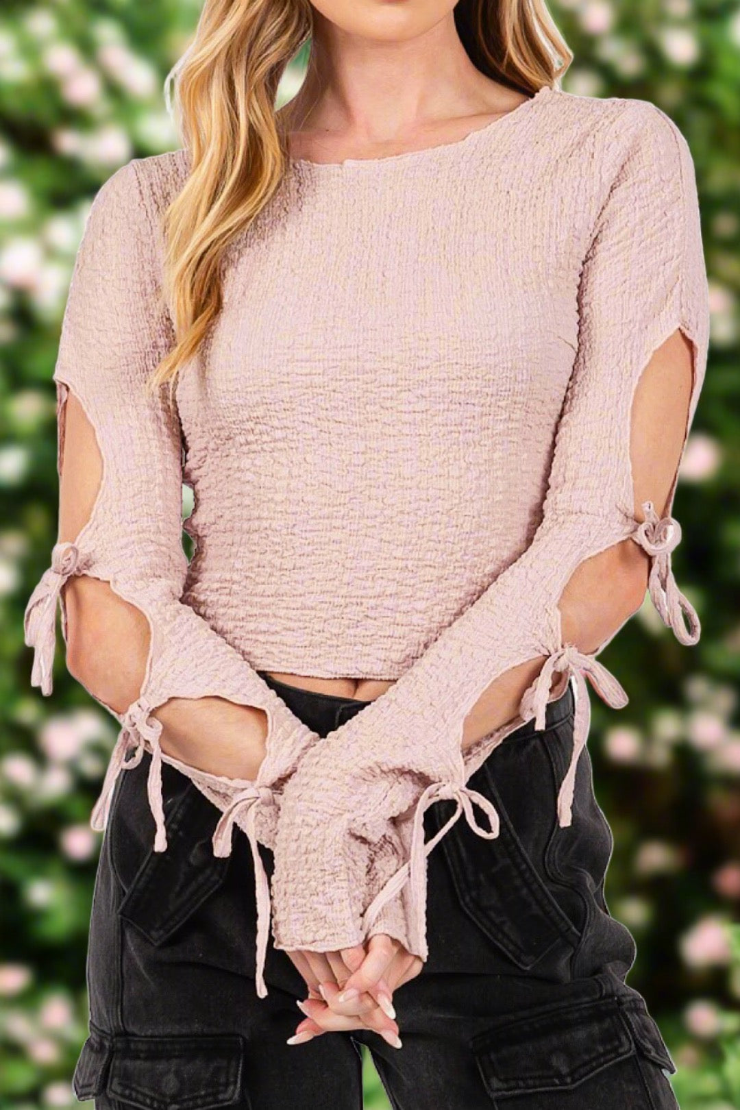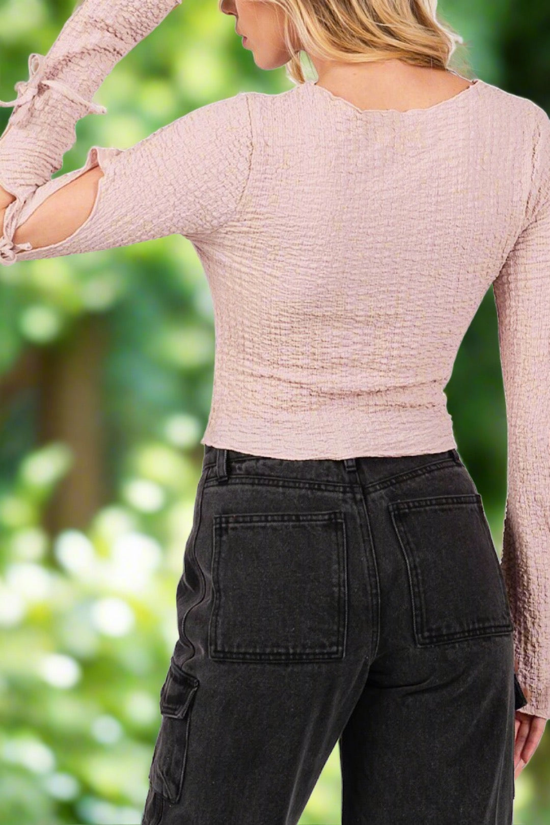 Embrace your inner enchantress with this charming long-sleeve cropped top. The solid color creates a beautifully understated base, letting the romantic details take center stage. Playful cut-out details on the sleeves add a touch of intrigue, while a ruffled round neckline and a slight ruffle detail on the hem provide a cascade of delicate femininity. The adjustable tie allows you to personalize the fit for a silhouette that flatters your figure. This versatile top can be dressed up with a skirt for a romantic evening or paired with jeans for a cute and casual daytime look. Wherever you go, you're sure to capture hearts in this unique and eye-catching piece.