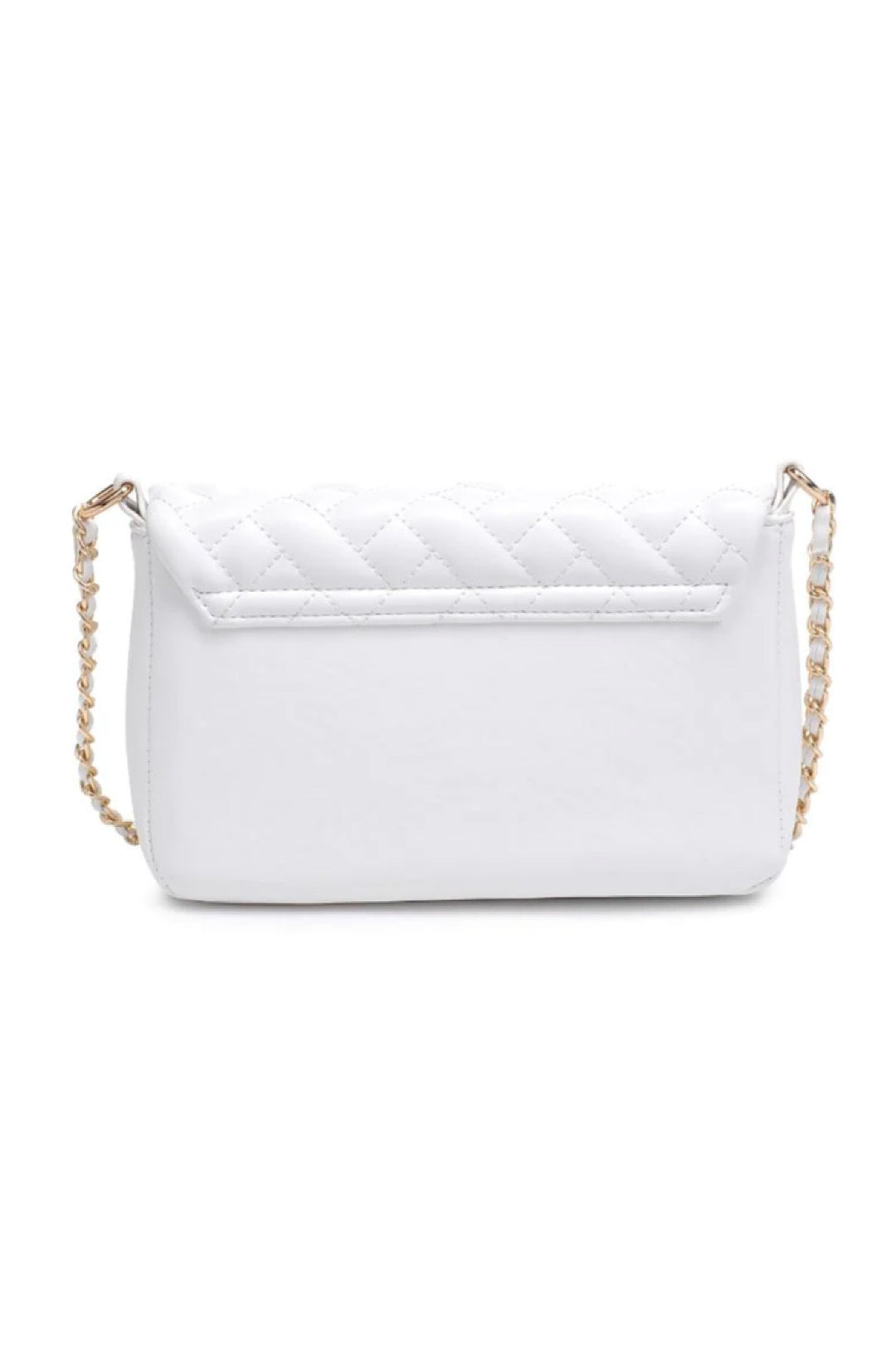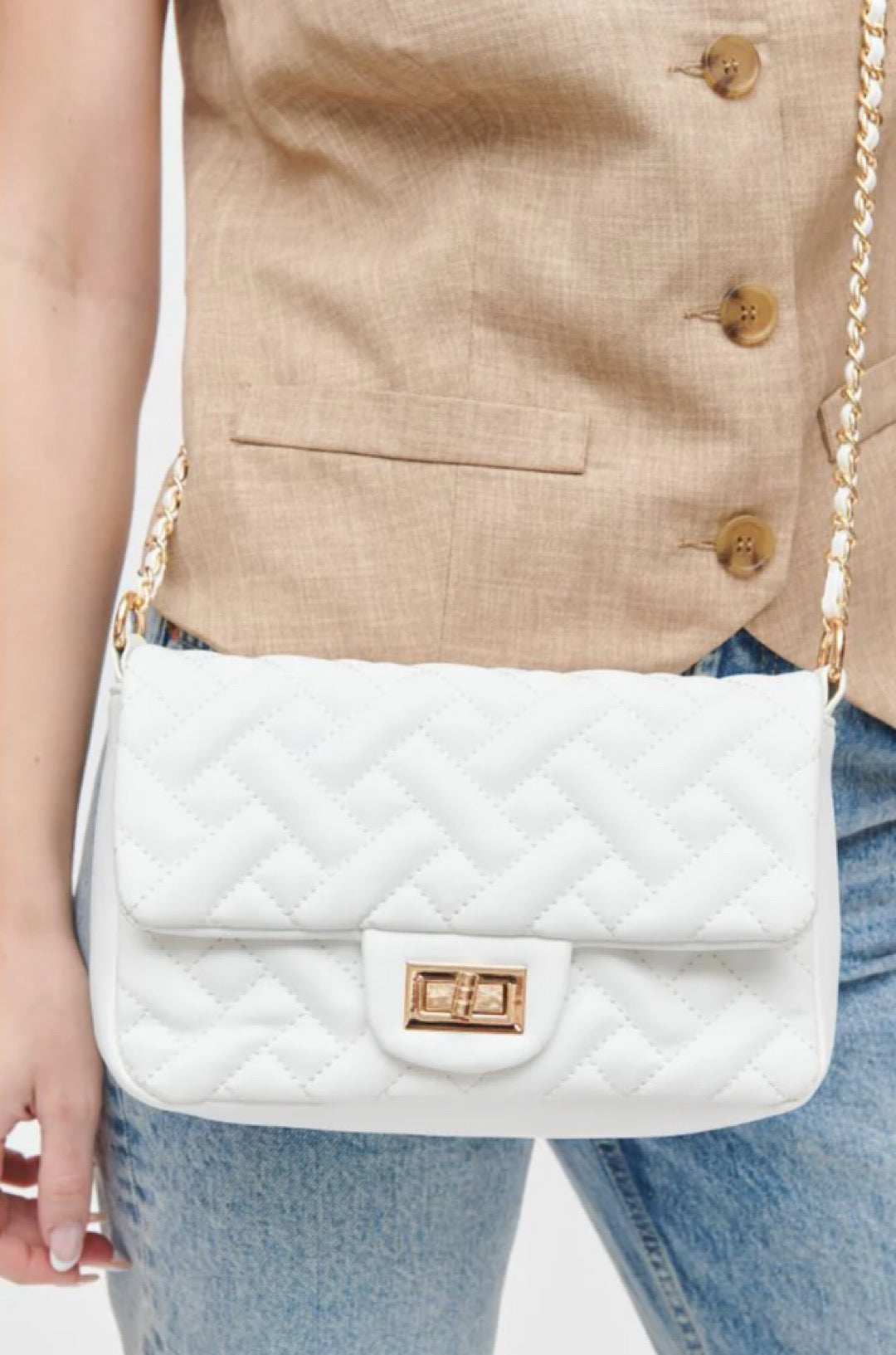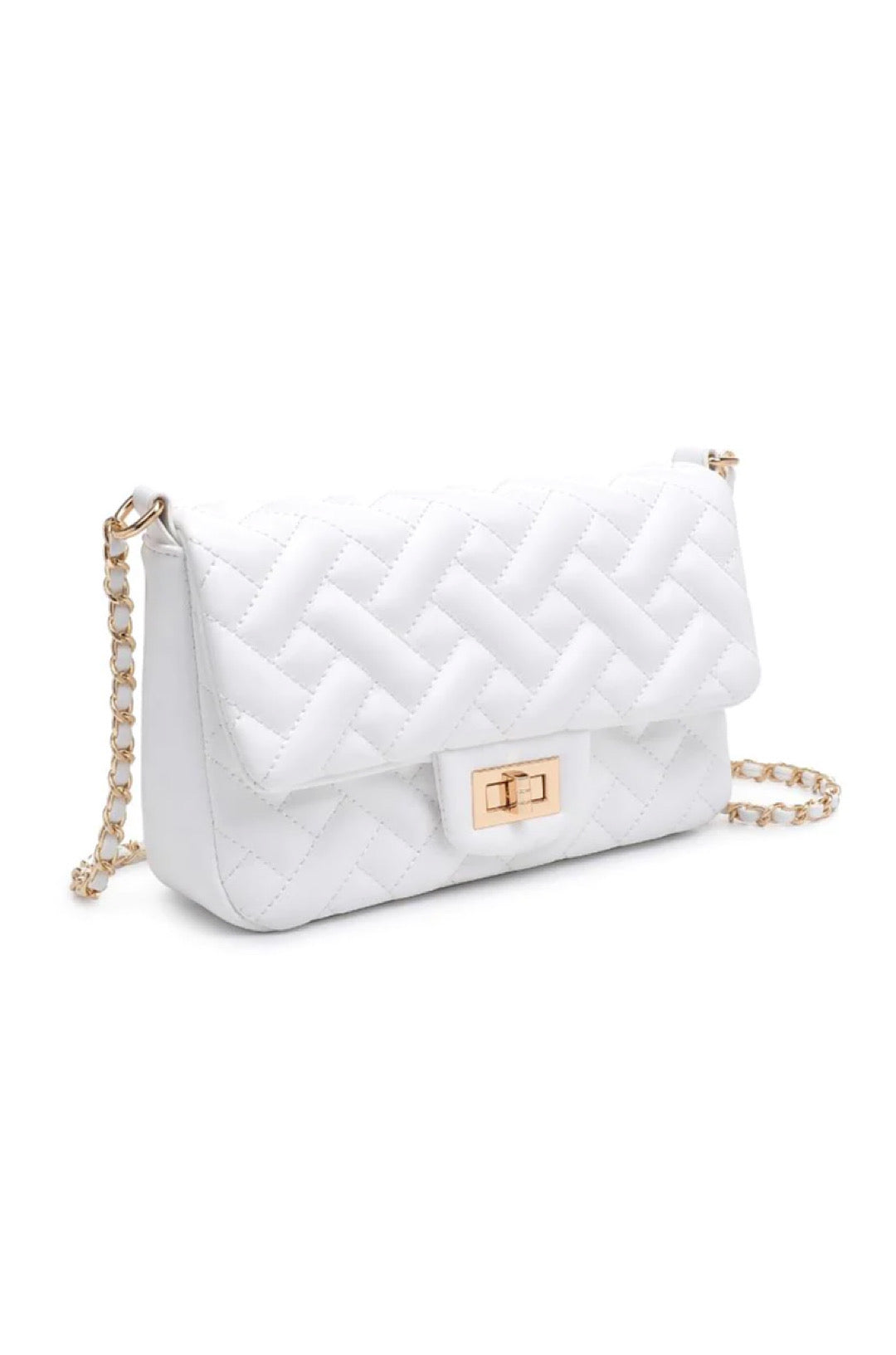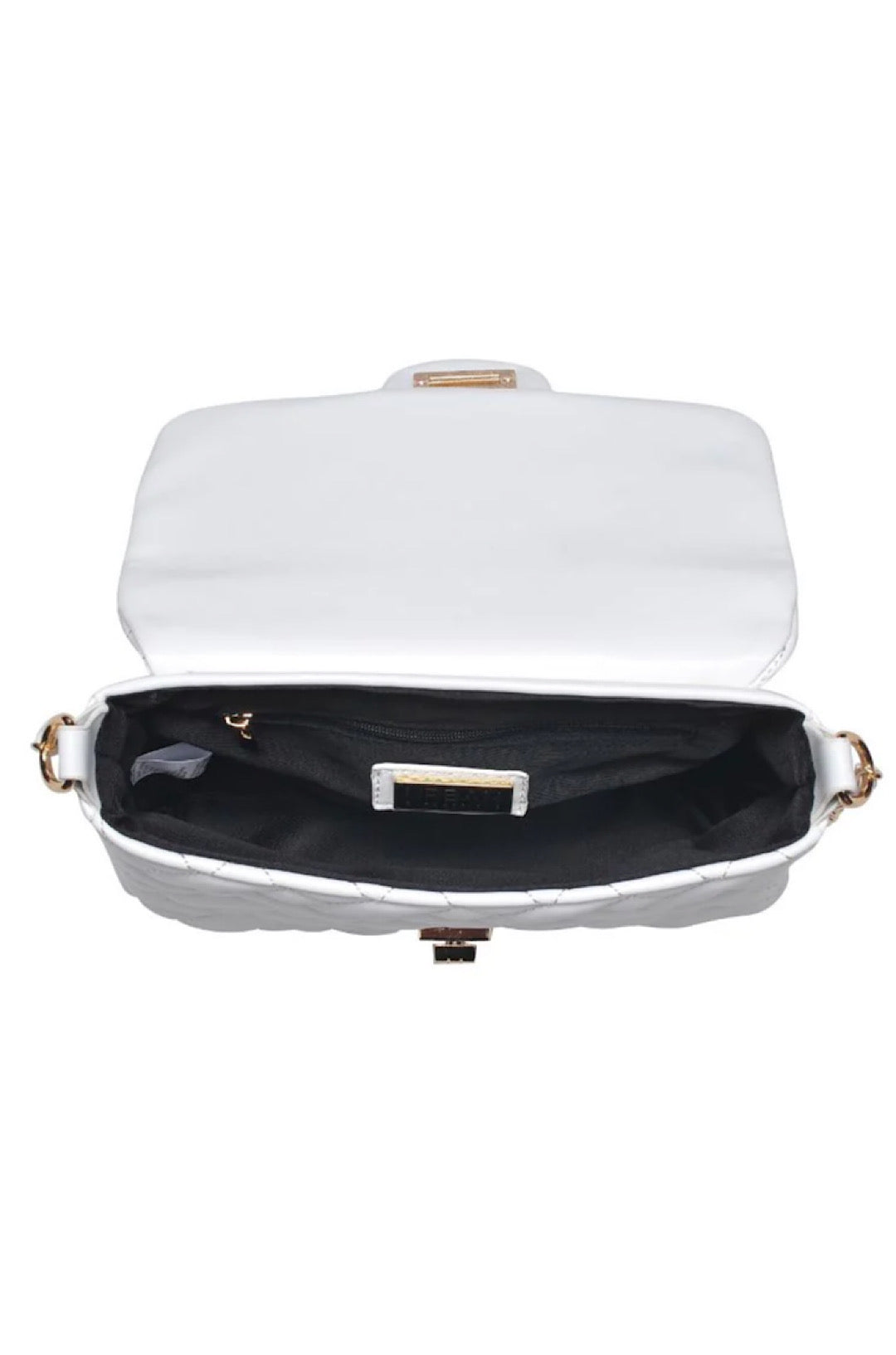 This stylish piece is crafted from vegan leather with eye-catching quilted detailing, and finished with golden hardware. With a shoulder strap, you can either remove it to carry as a chic clutch or secure it for some hands-free style. Opening the turnlock closure creates a hint of flair, while revealing the fabric lined interior complete with a zippered pocket to secure all your essentials.