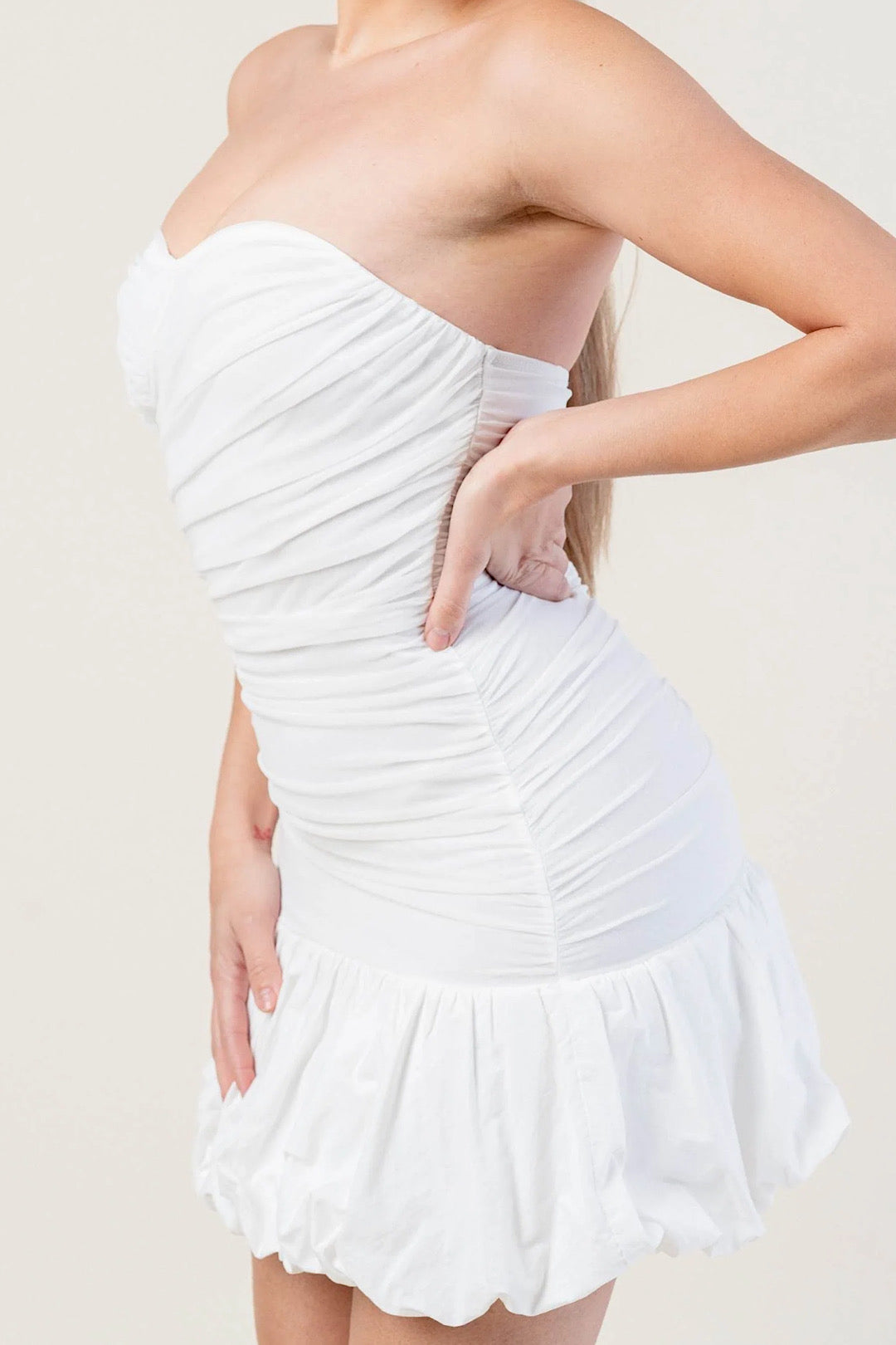 Effortlessly cool and undeniably sexy, this mini dress is perfect for the modern woman. The sheer onion mesh adds a touch of playful peek-a-boo, while the crinkled woven fabric creates a unique, effortlessly chic texture. The ruched sweetheart neckline accentuates your curves in the most flattering way, and the playful bubble hem adds a touch of unexpected drama. Made from a comfy blend of cotton, nylon, and spandex, this dress is as comfortable as it is stylish. Dress it up with heels for a night out, or keep it casual with sneakers and a leather jacket. This dress is your new go-to for effortless, head-turning style.
