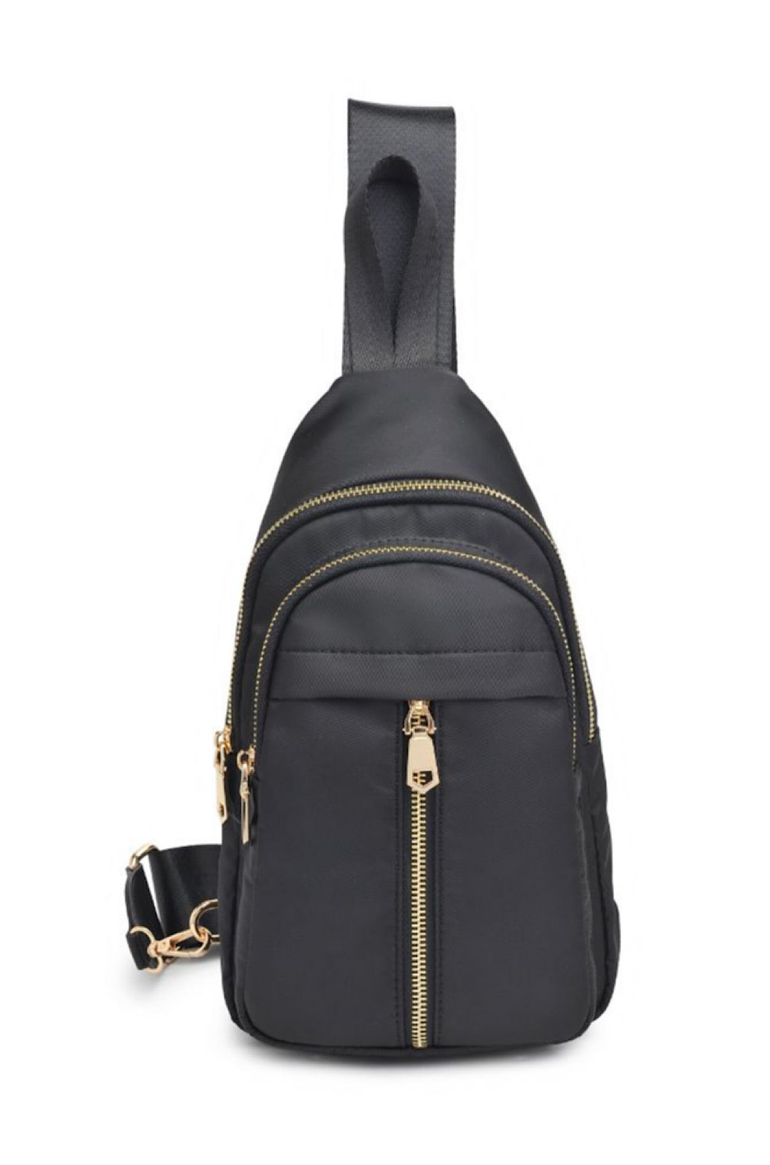 Exterior Details: Nylon with 1 zipper pocket, 2 zipper compartments, gold hardware