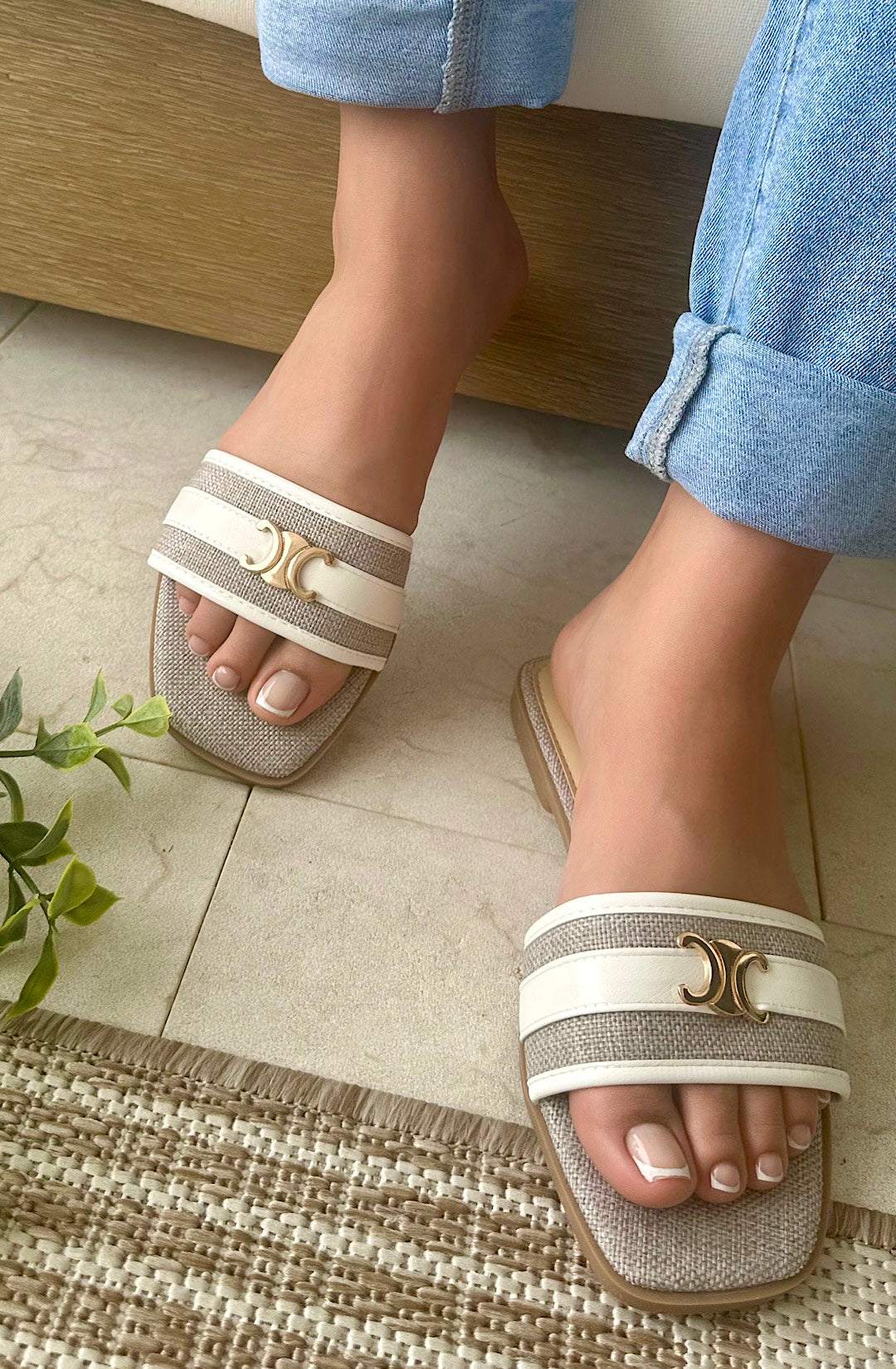 Step into summer with our raffia + faux leather slide sandals. Featuring a square toe and a sleek toe band design, these lightweight beauties combine natural texture with modern flair. The cushioned footbed keeps you comfy from day to night, while the easy slide-on style makes them your go-to for warm-weather days. Perfect with dresses, denim, or resort looks.