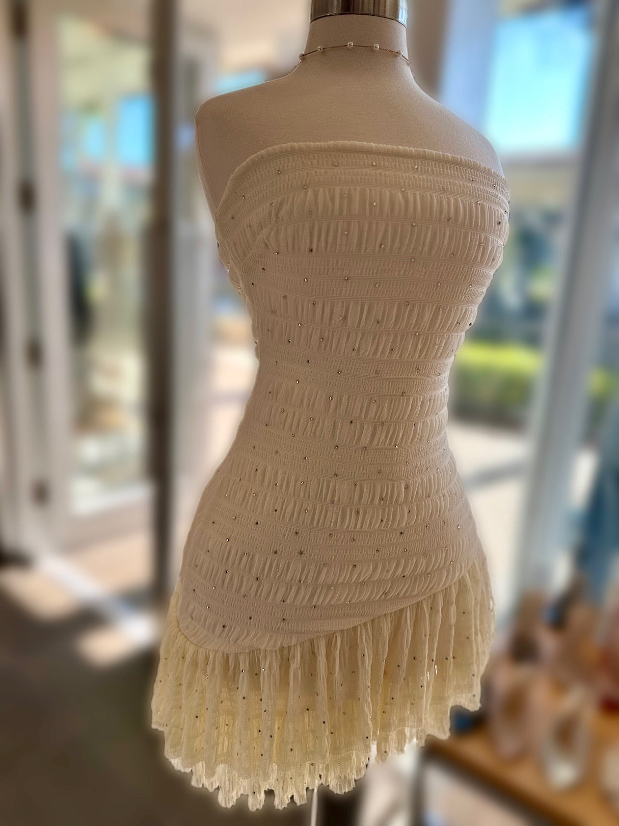 A captivating mini dress crafted from a shimmering smoked mesh, adorned with dazzling rhinestones and featuring a playful ruffled hem. Perfect for a night out.