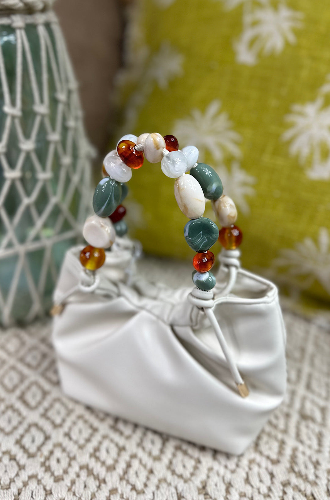 Exterior Details: Smooth Vegan Leather, Contrasting Marble Handle with Knotted Accents,