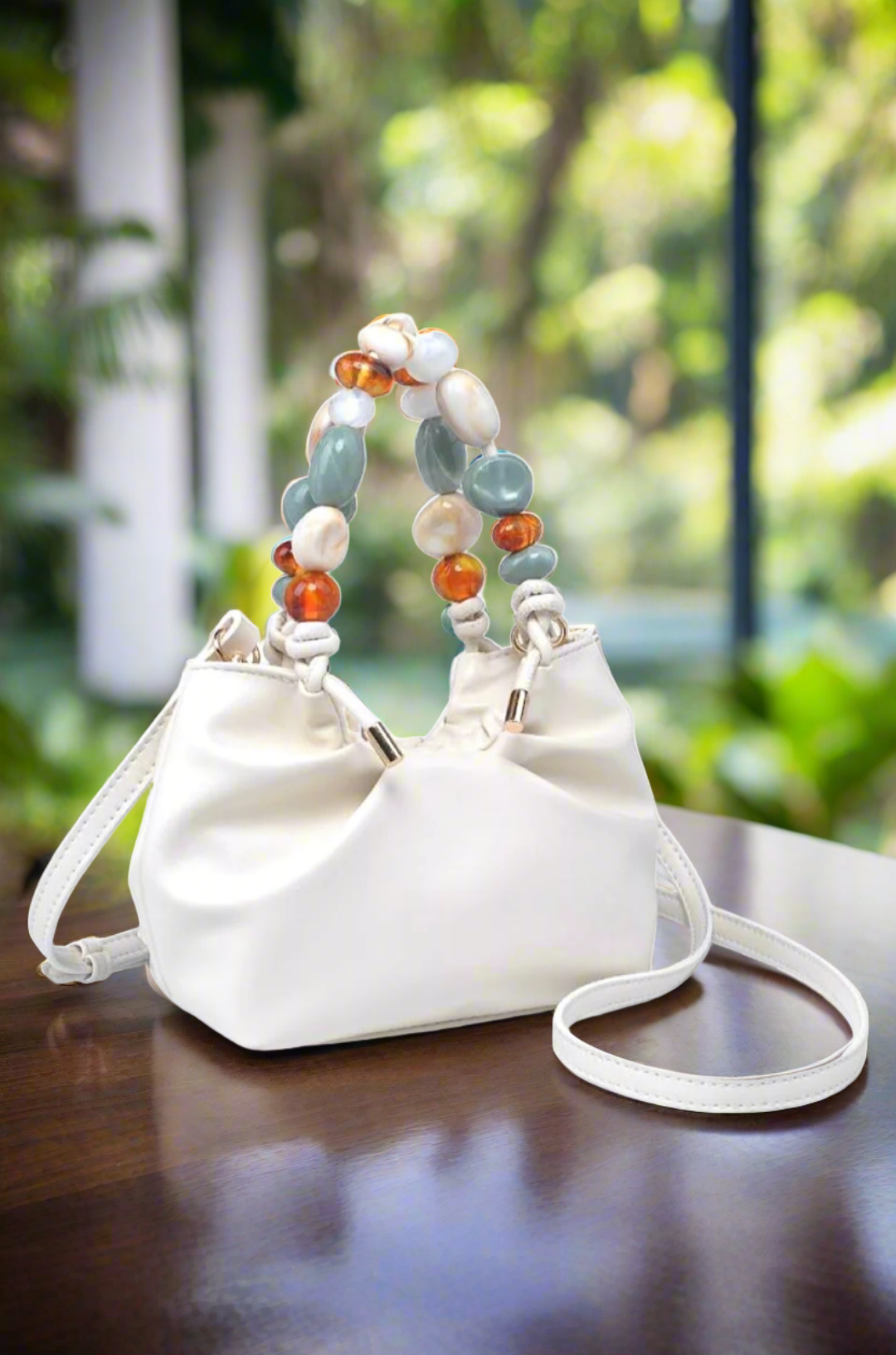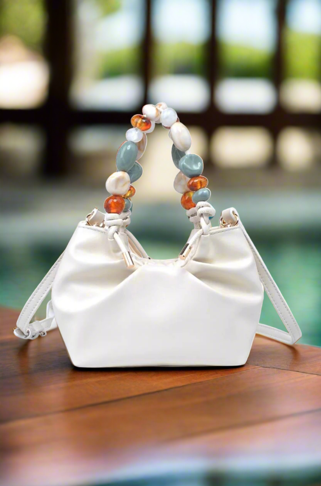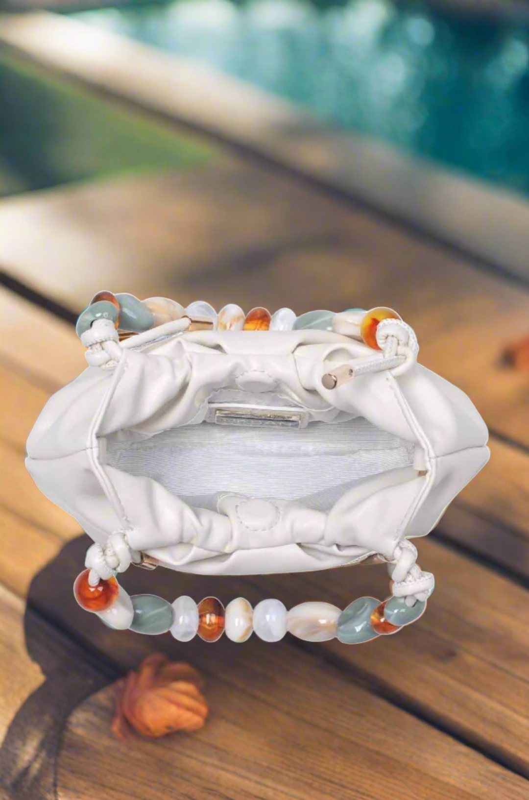 Crafted from smooth vegan leather, it flaunts a contrasting marble handle adorned with knotted accents. The gold hardware and ruched details add flair, while the fabric-lined interior keeps your essentials neatly organized with a slip pocket.